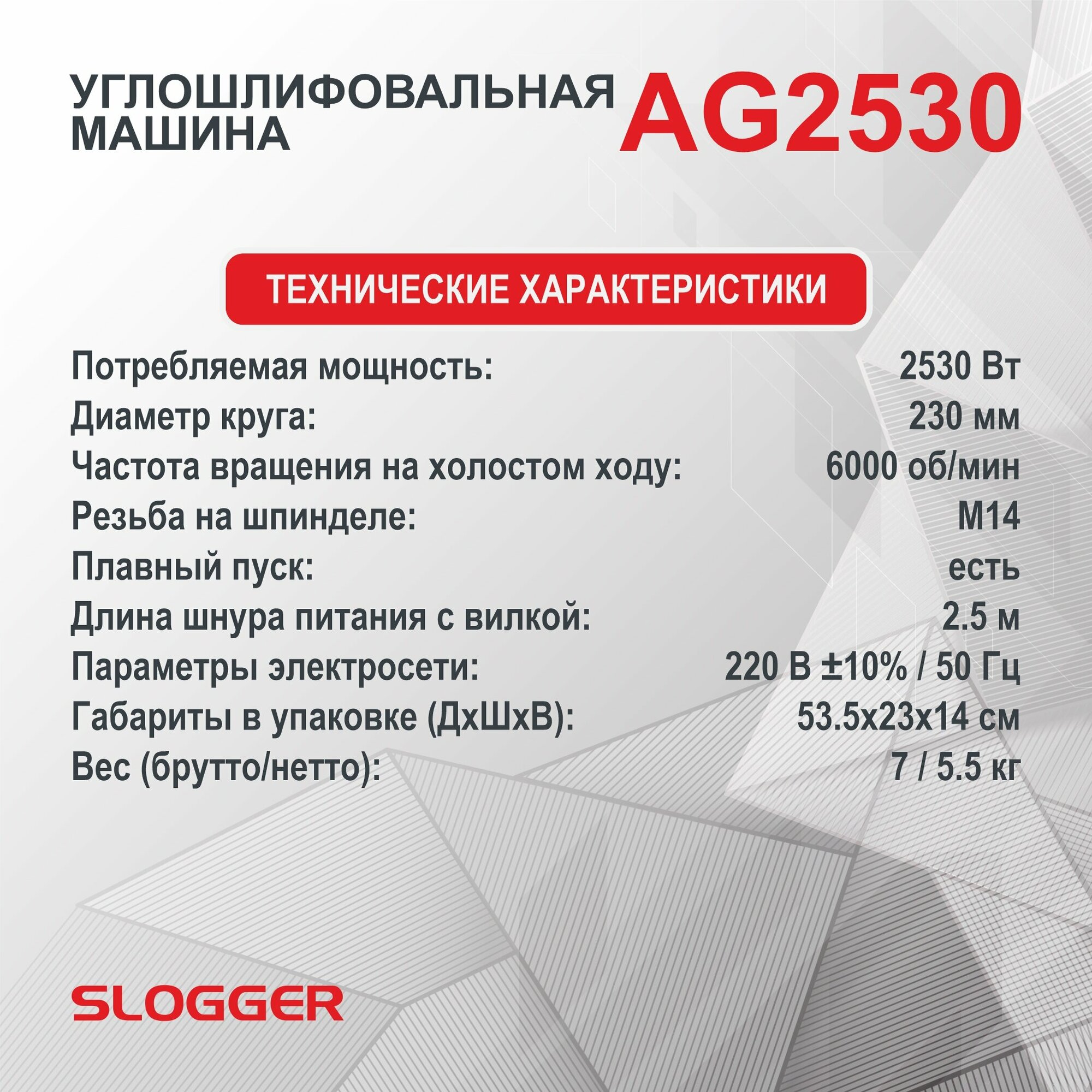 Угловая шлифмашина (УШМ) Slogger AG2530 2500Вт, 230мм