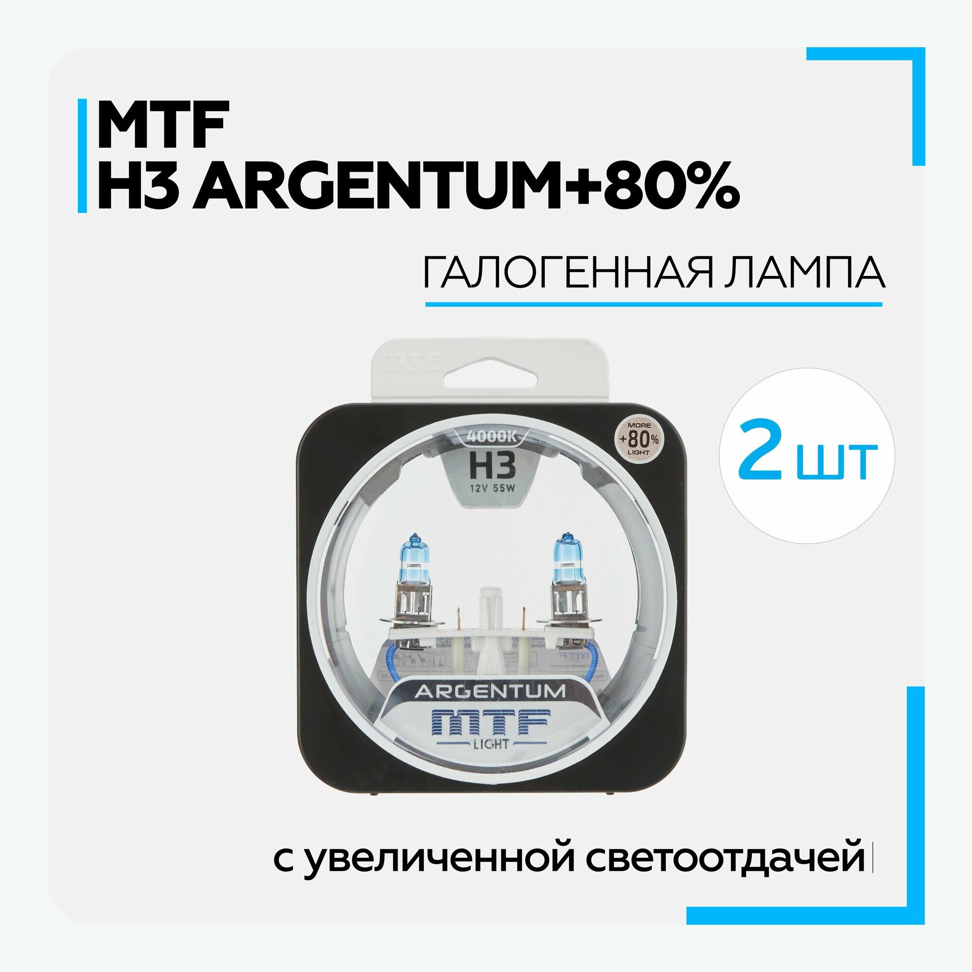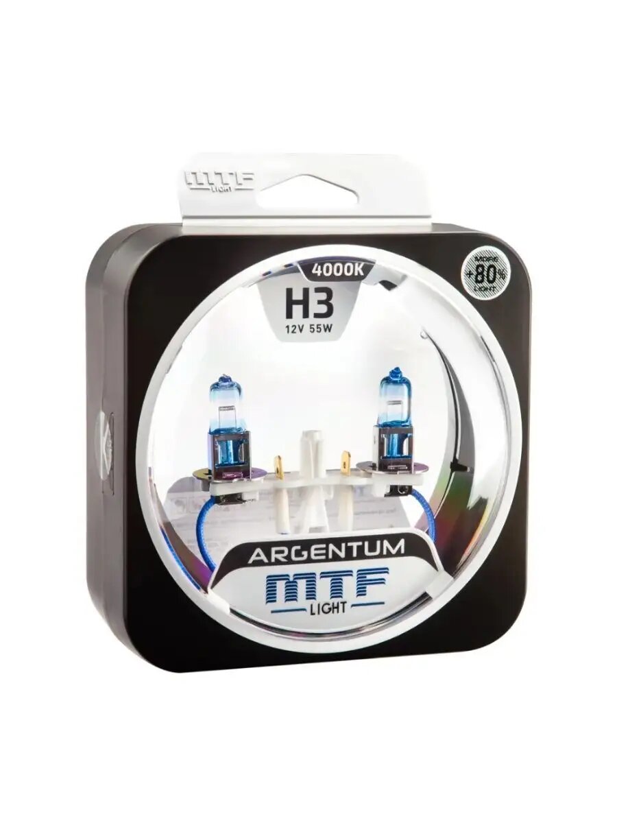 Галогенные автолампы MTF Light серия ARGENTUM +80% H3, 12V, 55W, комплект 2 лампы