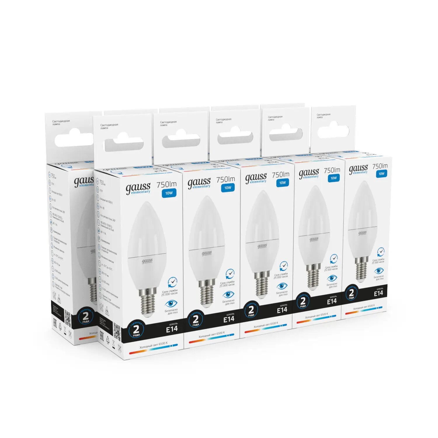Купить Лампочка светодиодная E14 Свеча 10W холодный белый свет 6500K упаковка 10 штук Gauss Elementary