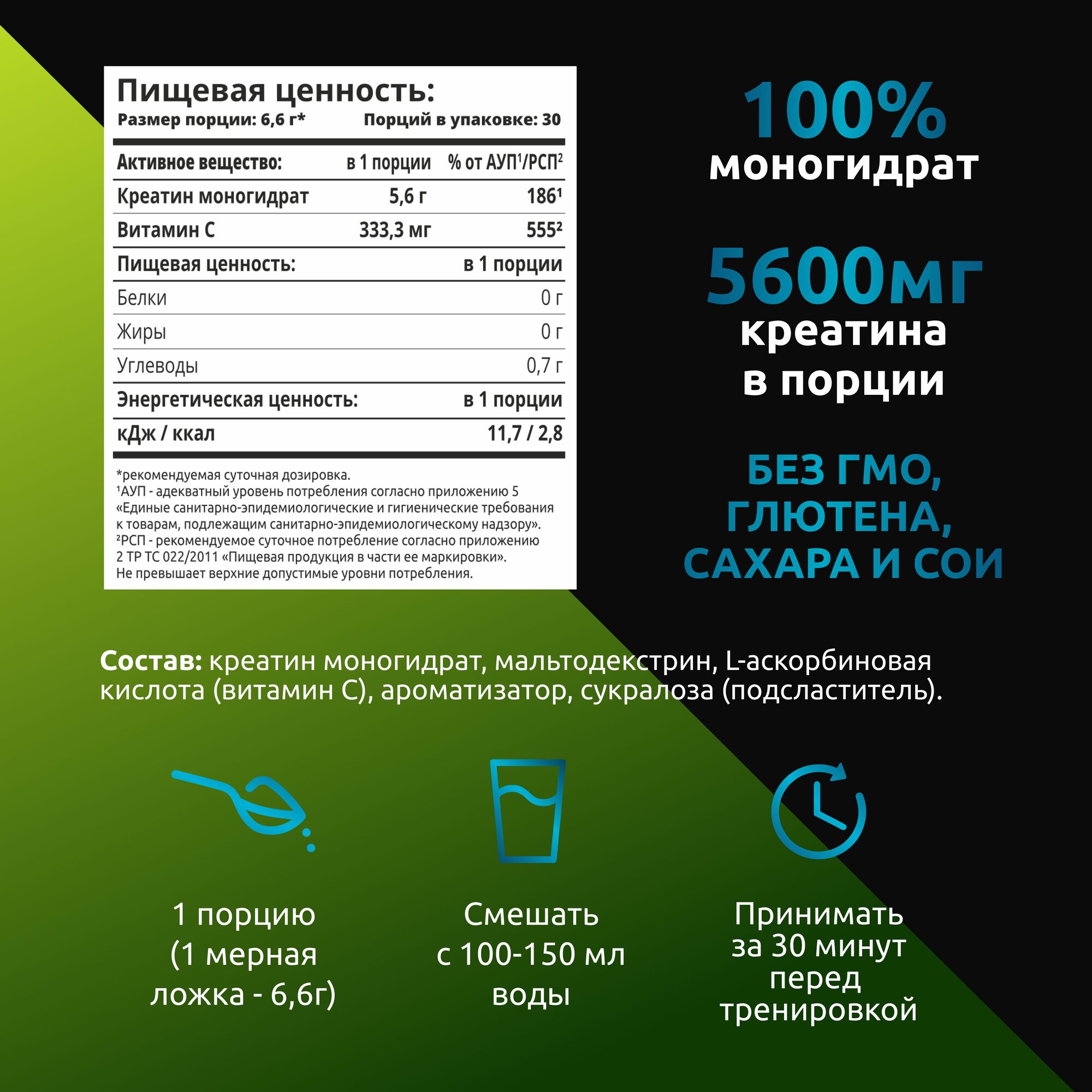 | Дополнительная информация | рекомендации по применению: Рекомендовано принимать по одной мерной ложке (6.6 г), растворив порошок в 250 мл воды, не более двух раз в день. Длительность курса составляет 45-60 дней. Далее можно сделать перерыв в 30-45 дней. Противопоказан людям с непереносимостью любого из компонентов продукта. Не рекомендуется принимать детям до 18 лет, беременным и кормящим женщинам. Перед применением проконсультируйтесь со специалистом.; состав: Креатин моногидрат, мальтодекстрин, лимонная кислота - регулятор кислотности, ароматизатор, диоксид кремния - антислеживающий агент, подсластитель - сукралоза, краситель - зелёное яблоко R100. |