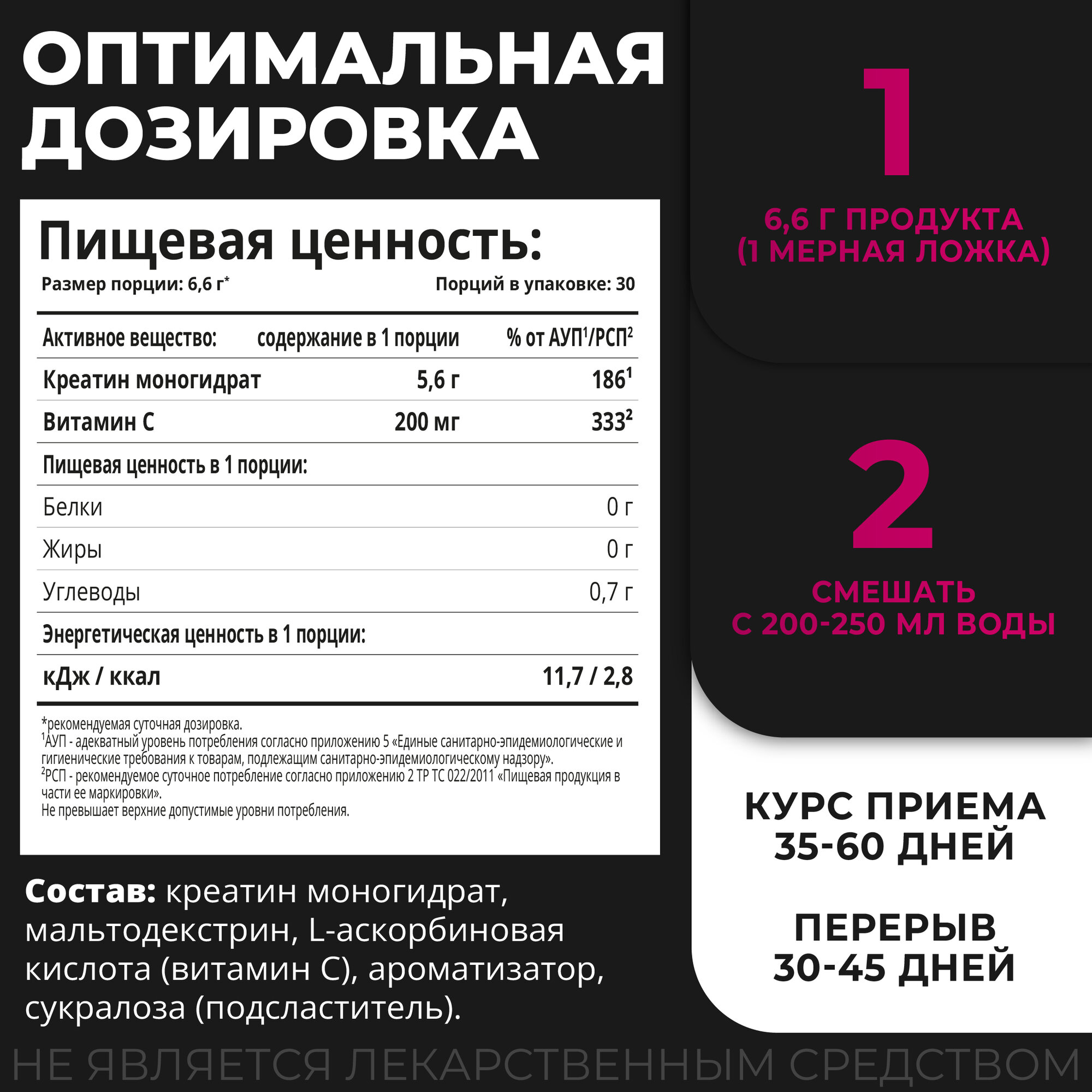 | Дополнительная информация | рекомендации по применению: Рекомендуется принимать по одной мерной ложке (6.6 г), растворив порошок в 250 мл воды или сока; состав: креатин моногидрат, мальтодекстрин, аскорбиновая кислота, подсластитель - сукралоза, ароматизатор |