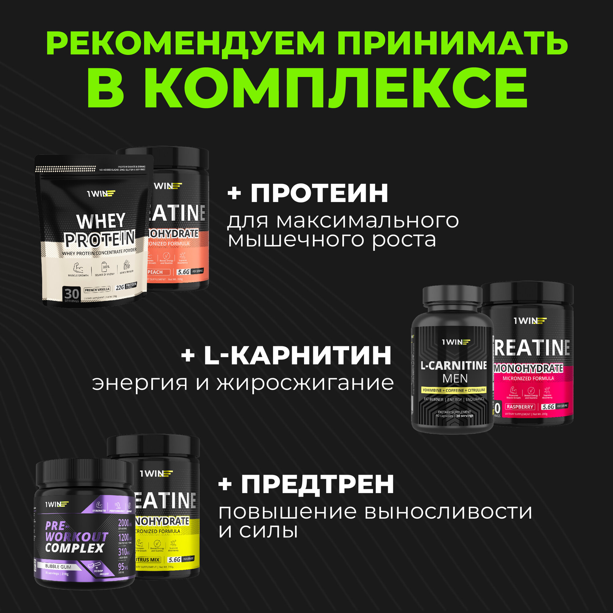 Набор креатинов из 3 шт, Креатин моногидрат порошок 1WIN, Creatine Monohydrate, Вкус Нейтральный, 30 порций, спортивное питание для набора массы тела