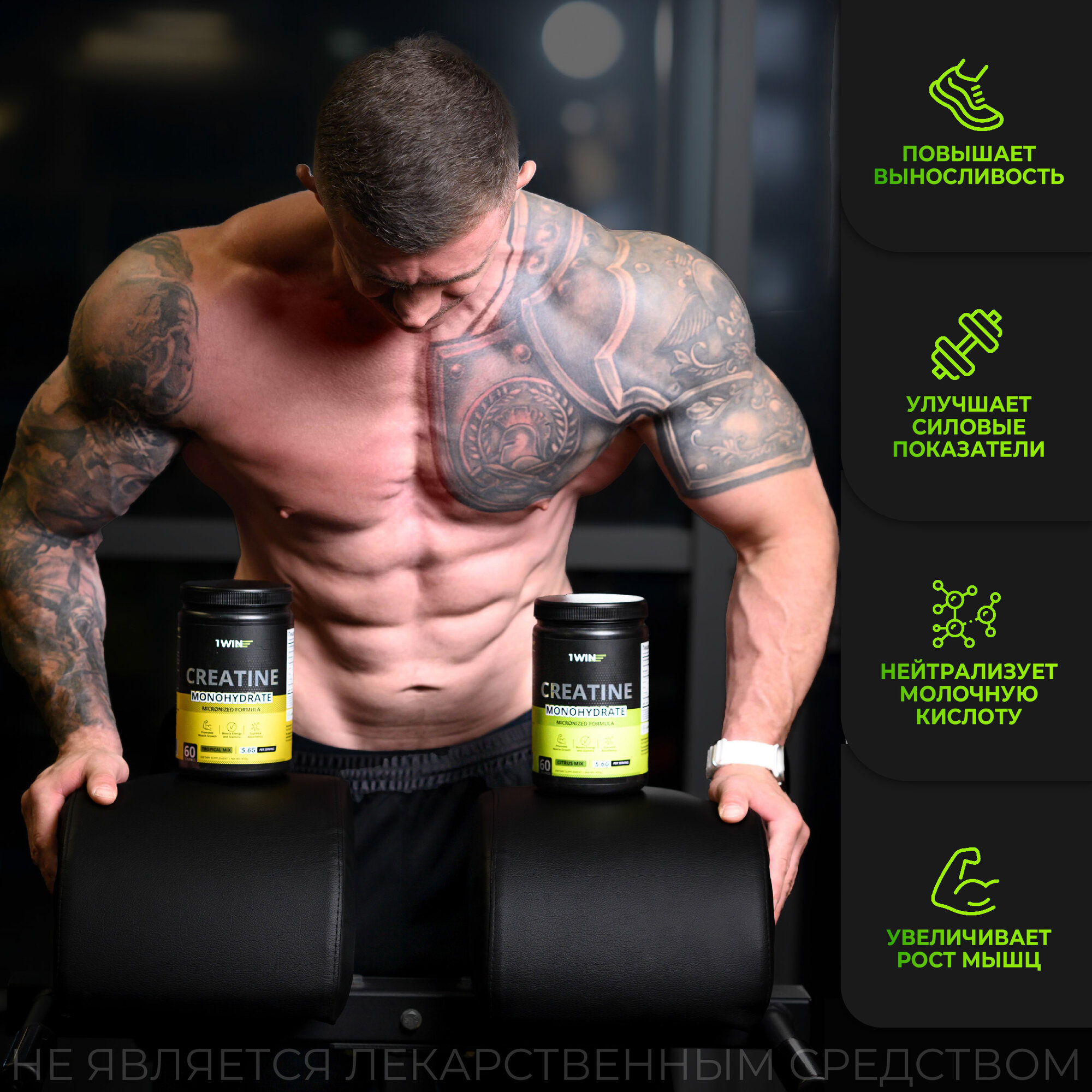 Креатин моногидрат порошок 1WIN, Creatine Monohydrate, Вкус Цитрусовый микс, 60 порций, спортивное питание для набора массы тела