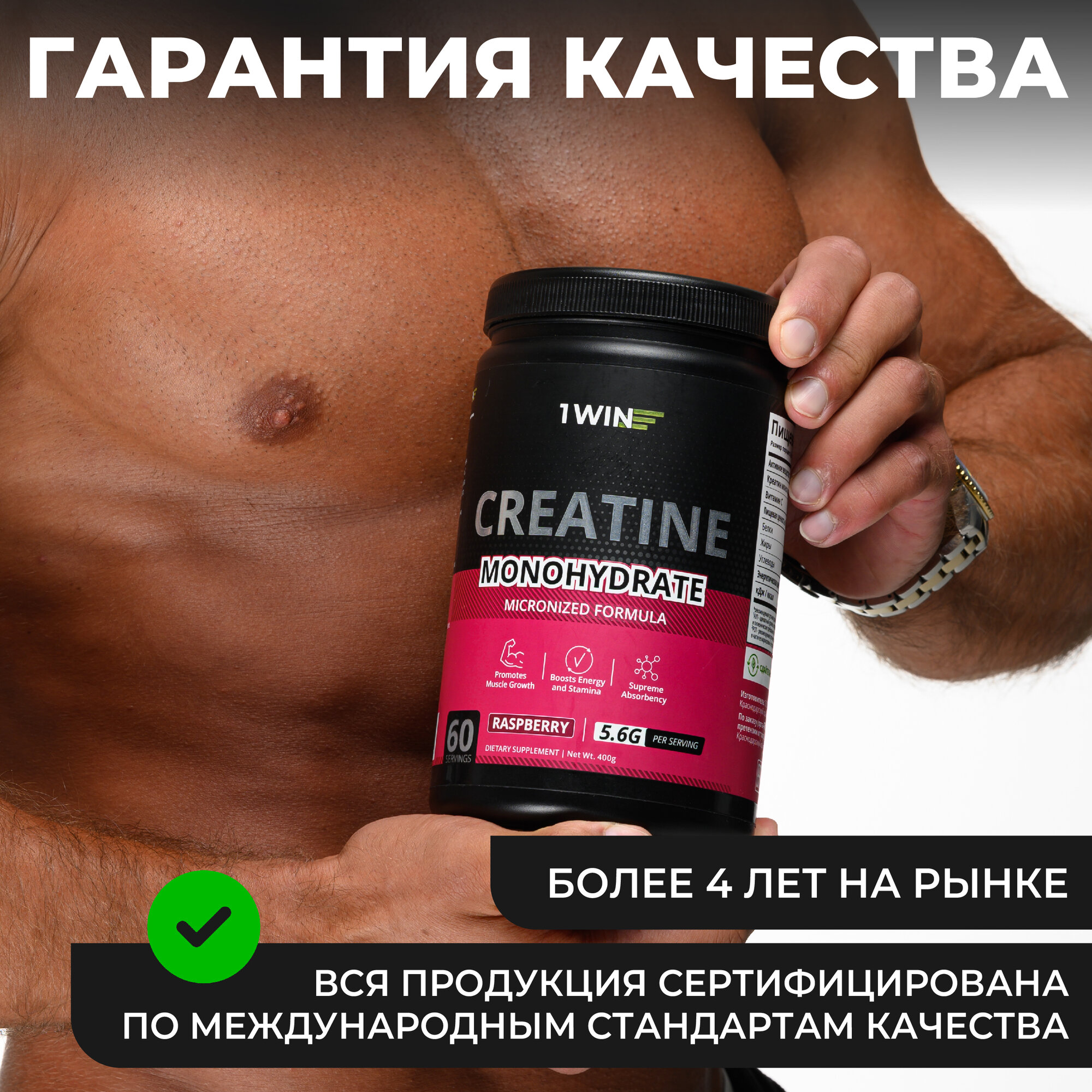 Креатин моногидрат порошок 1WIN, Creatine Monohydrate, Вкус Малина, 60 порций, спортивное питание для набора массы тела