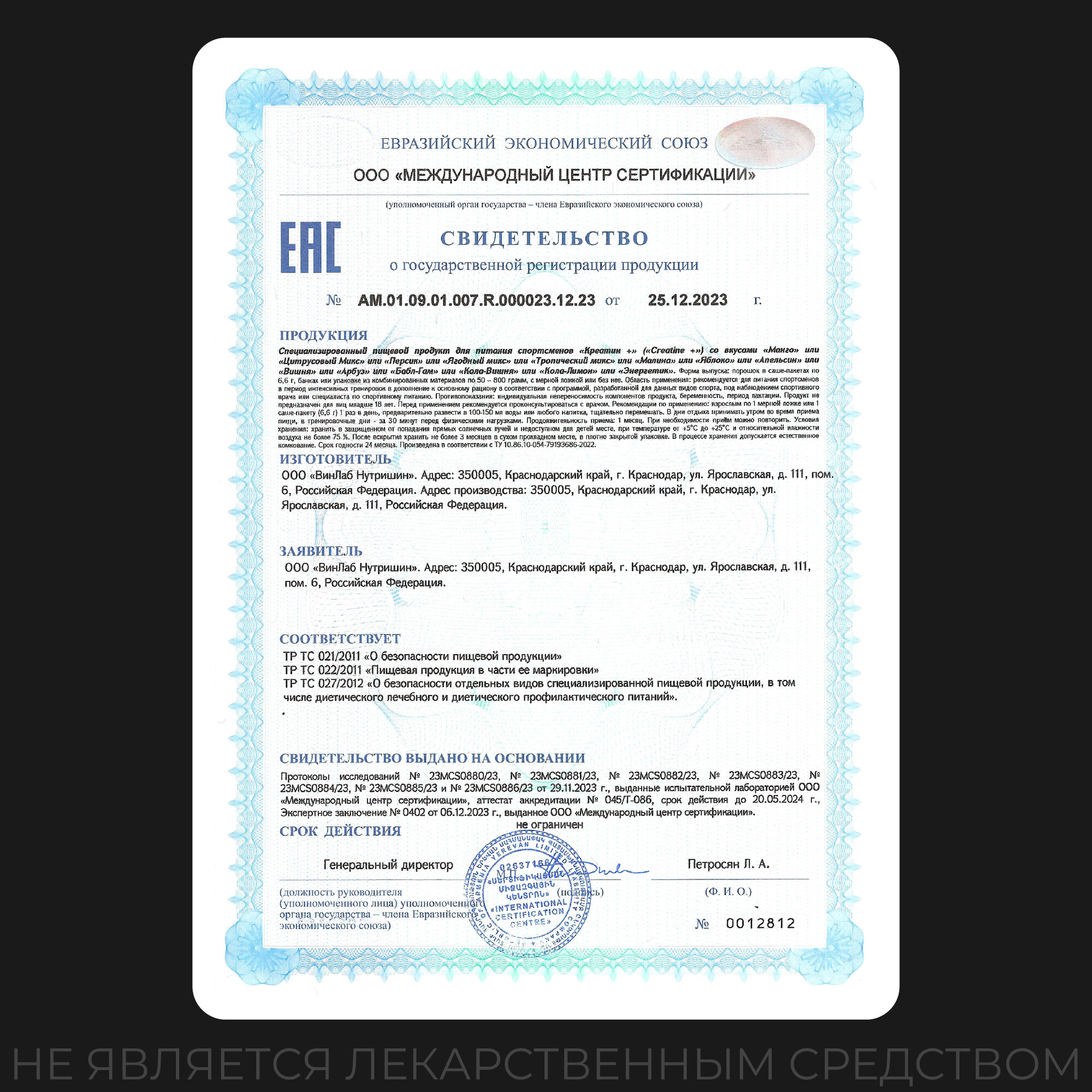 | Дополнительная информация | рекомендации по применению: Рекомендуется принимать по одной мерной ложке (6.6 г), растворив порошок в 250 мл воды или сока; состав: креатин моногидрат, мальтодекстрин, аскорбиновая кислота, подсластитель - сукралоза, ароматизатор |