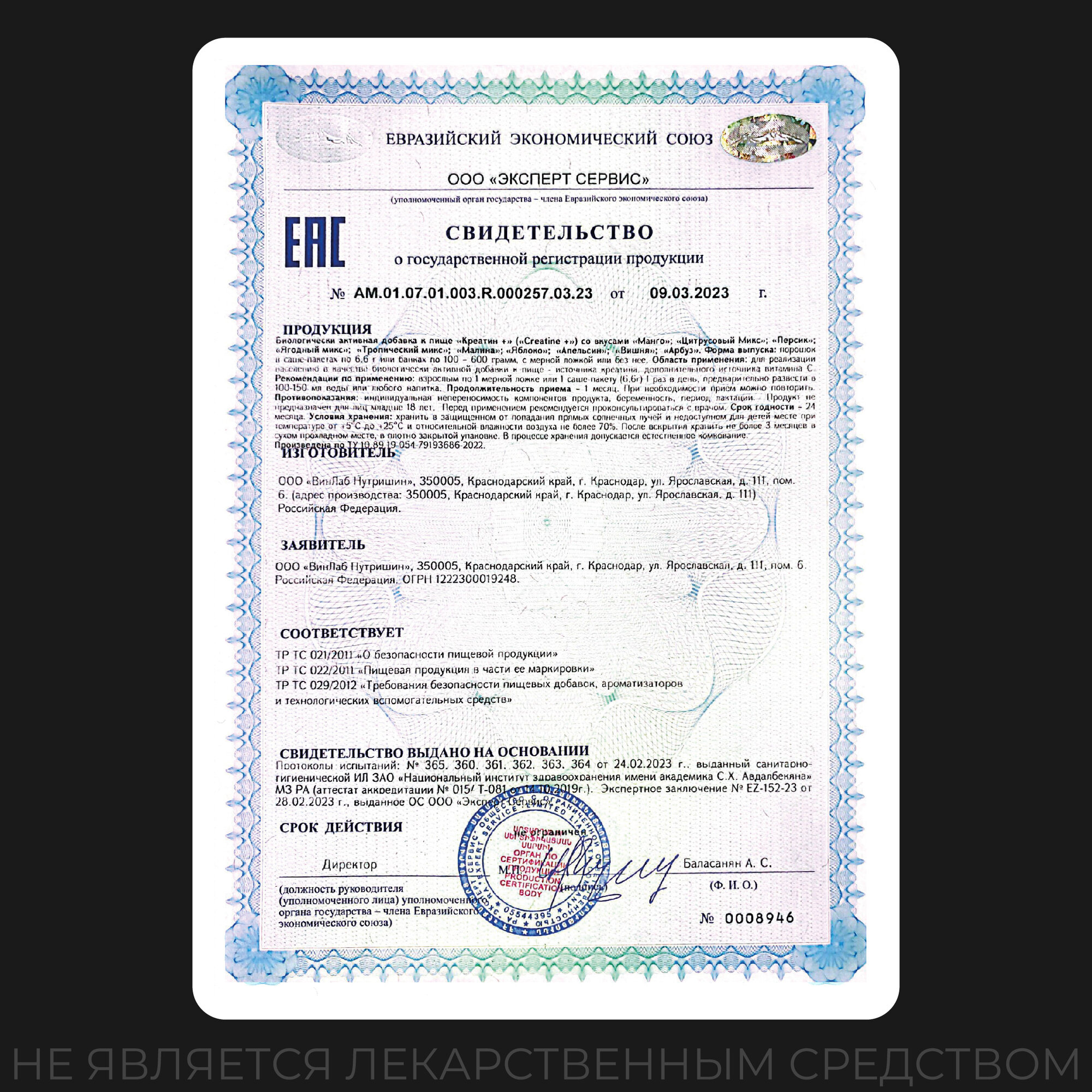 | Дополнительная информация | рекомендации по применению: Рекомендуется принимать по одной мерной ложке (6.6 г), растворив порошок в 250 мл воды или сока; состав: креатин моногидрат, мальтодекстрин, аскорбиновая кислота, подсластитель - сукралоза, ароматизатор |