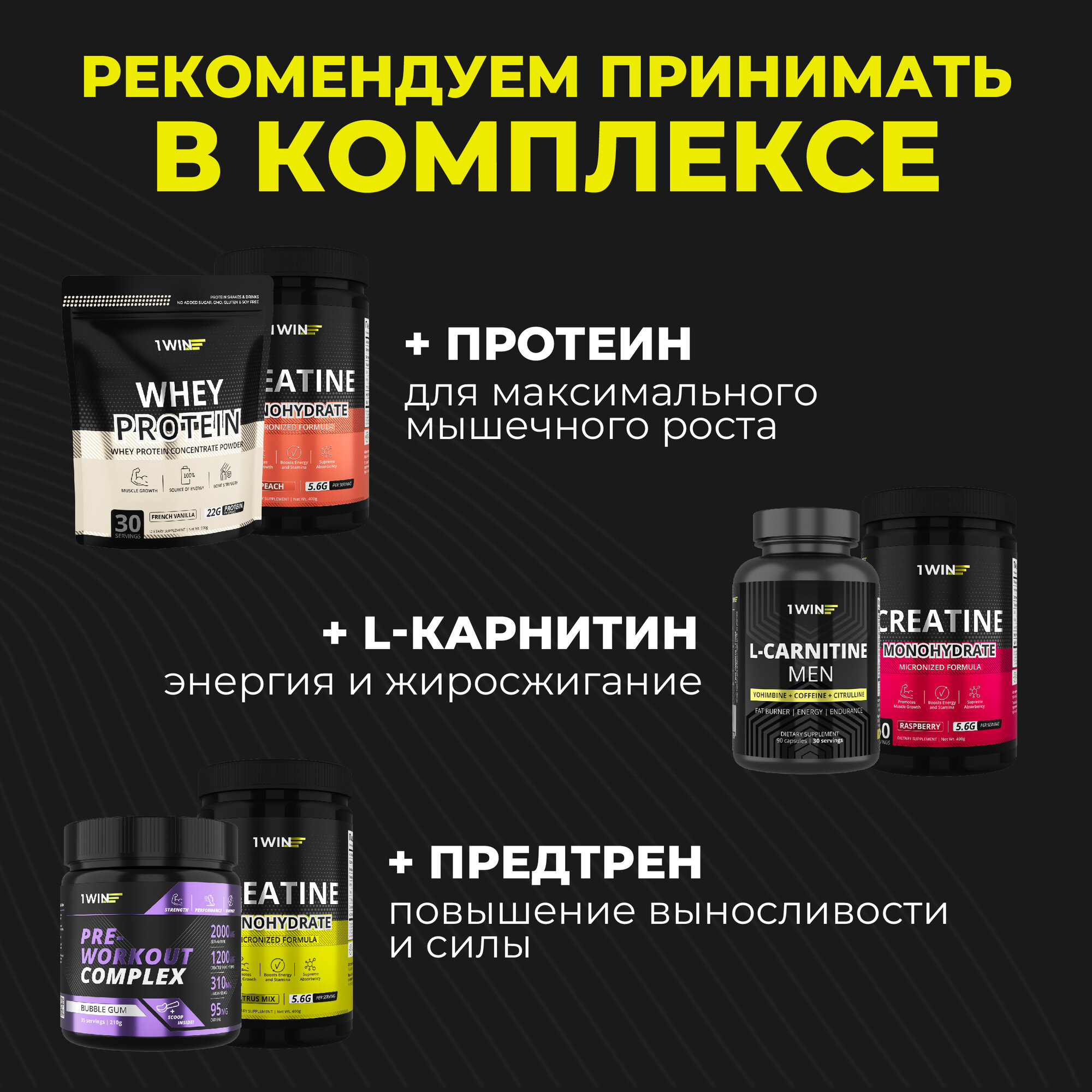 Набор креатинов из 3 шт, Креатин моногидрат порошок 1WIN, Creatine Monohydrate, Вкус Нейтральный, 30 порций, спортивное питание для набора массы тела