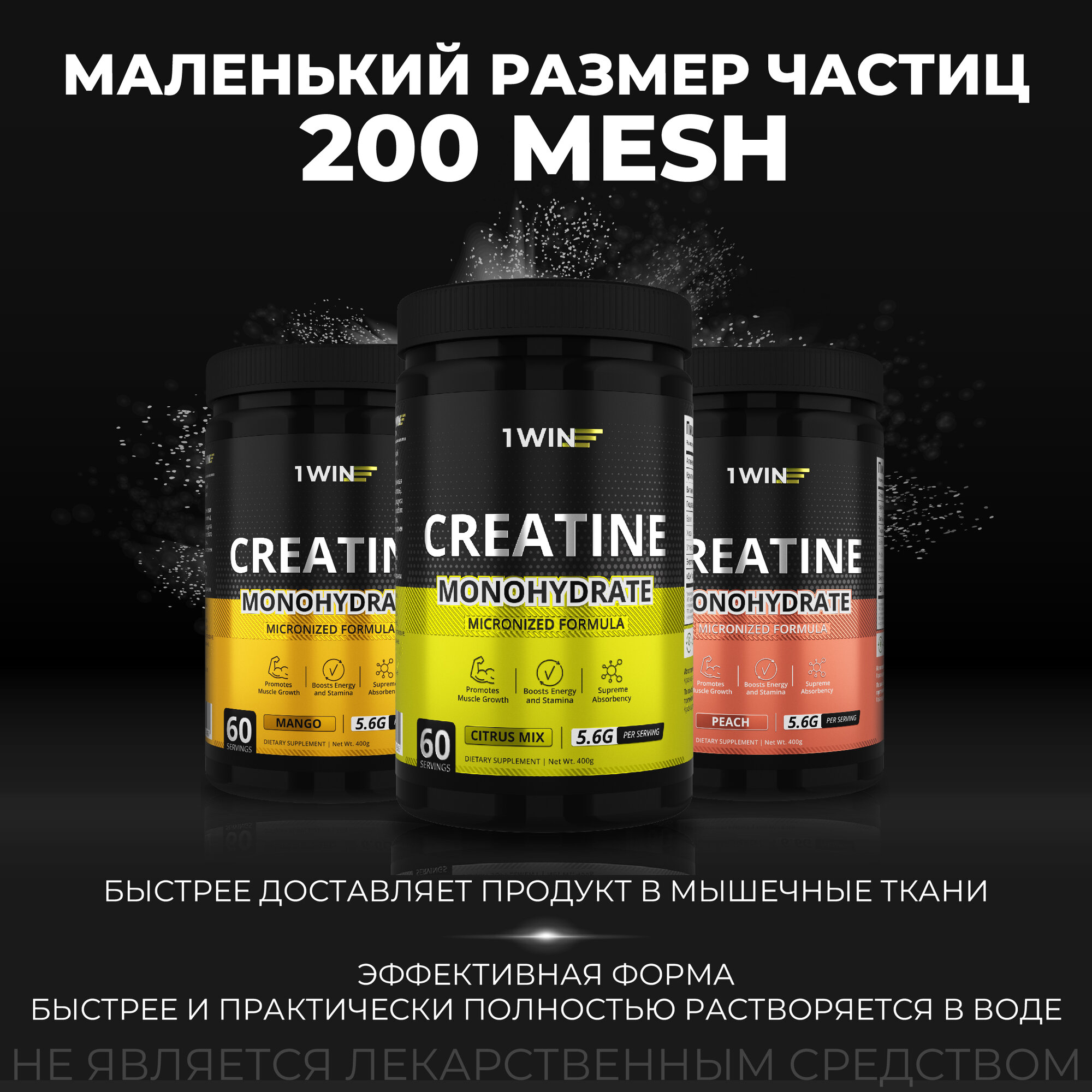 Креатин моногидрат порошок 1WIN, Creatine Monohydrate, Вкус Цитрусовый микс, 60 порций, спортивное питание для набора массы тела