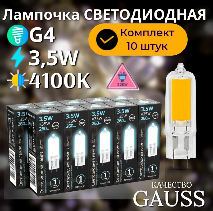Лампочка светодиодная G4 220V 3.5W нейтр белый свет 4100K упаковка 10 штук Gauss