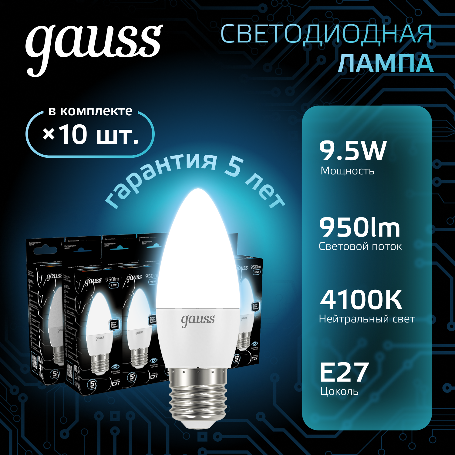Купить Лампочка светодиодная Е27 Свеча 9.5W нейтр белый свет 4100К упаковка 10 шт. Gauss Black
