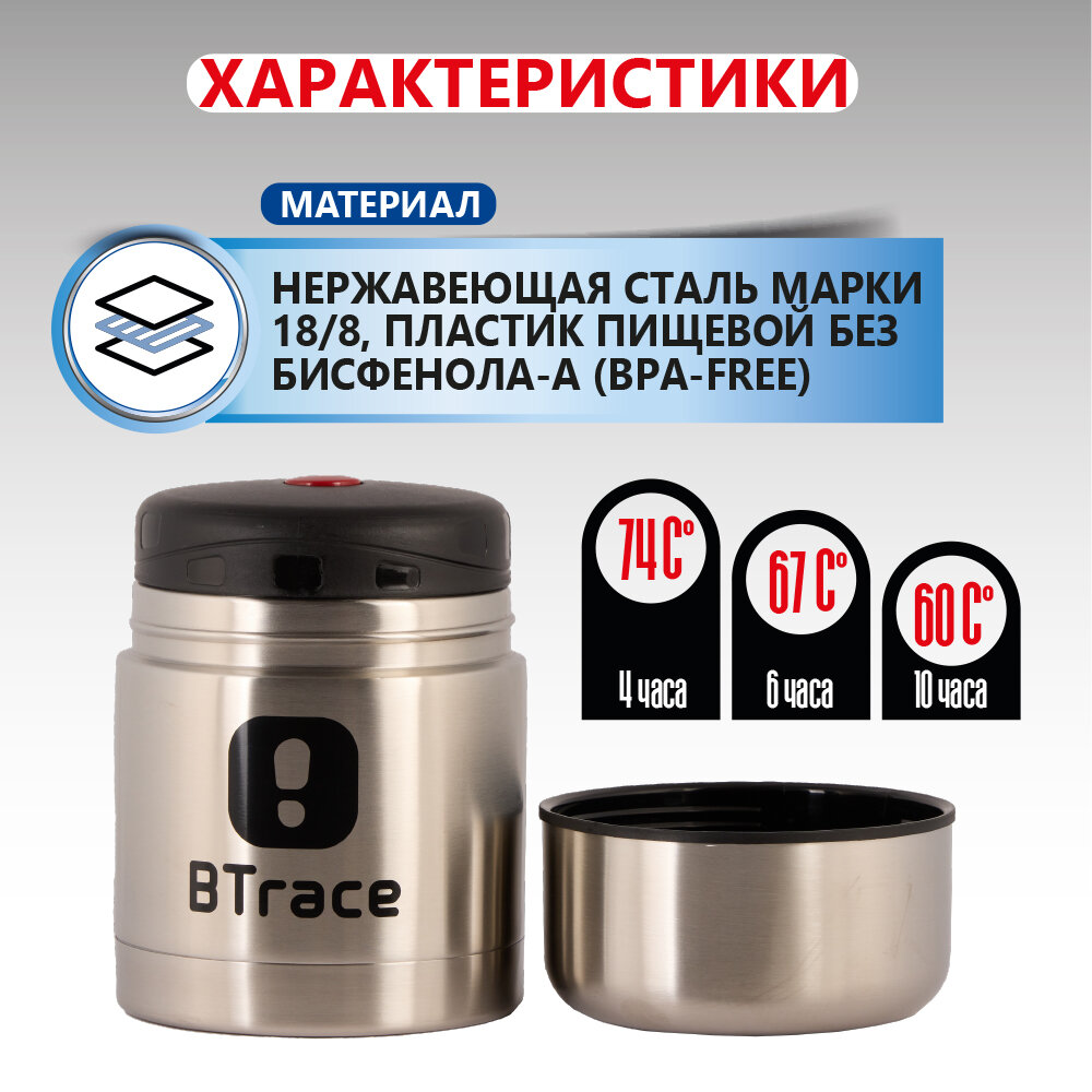 Купить Термос для еды и напитков Btrace 0,5 л, двойные стенки, серый, нержавеющая сталь, широкая горловина, крышка-чашка