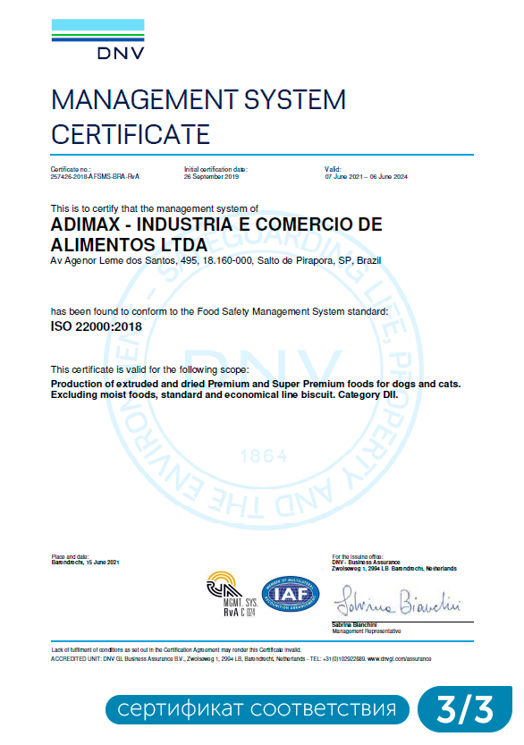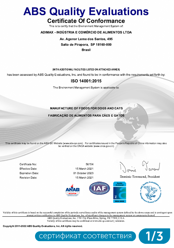 | Состав | Мука из мяса курицы, дробленый рис, пшеничные отруби, куриный жир, масло лосося, семена льна, натуральный усилитель вкуса, обезвоженные фрукты и овощи (манго, яблоко, морковь, томаты), свекольный жом, хлорид натрия, мука из морских водорослей Schizochytrium sp., пребиотики (маннанолигосахариды, фруктоолигосахариды и инулин), экстракт Юкки Шидигера (Yucca schidigera) (0,04%), хондроитина сульфат (0,01%), глюкозамина сульфат (0,03%), витамины (A, D3, E, K3, C, B1, B2, B6, B12, биотин, пантотенат кальция, фолиевая кислота, ниацин, хлорид холина), минералы (железо, медь, кальций, калий, цинк, марганец, селен, натрий), гексаметафосфат натрия, пропионовая кислота, экстракты растений (зеленый чай, розмарин, мята), экстракт токоферола (природный антиоксидант) (0,01%). |