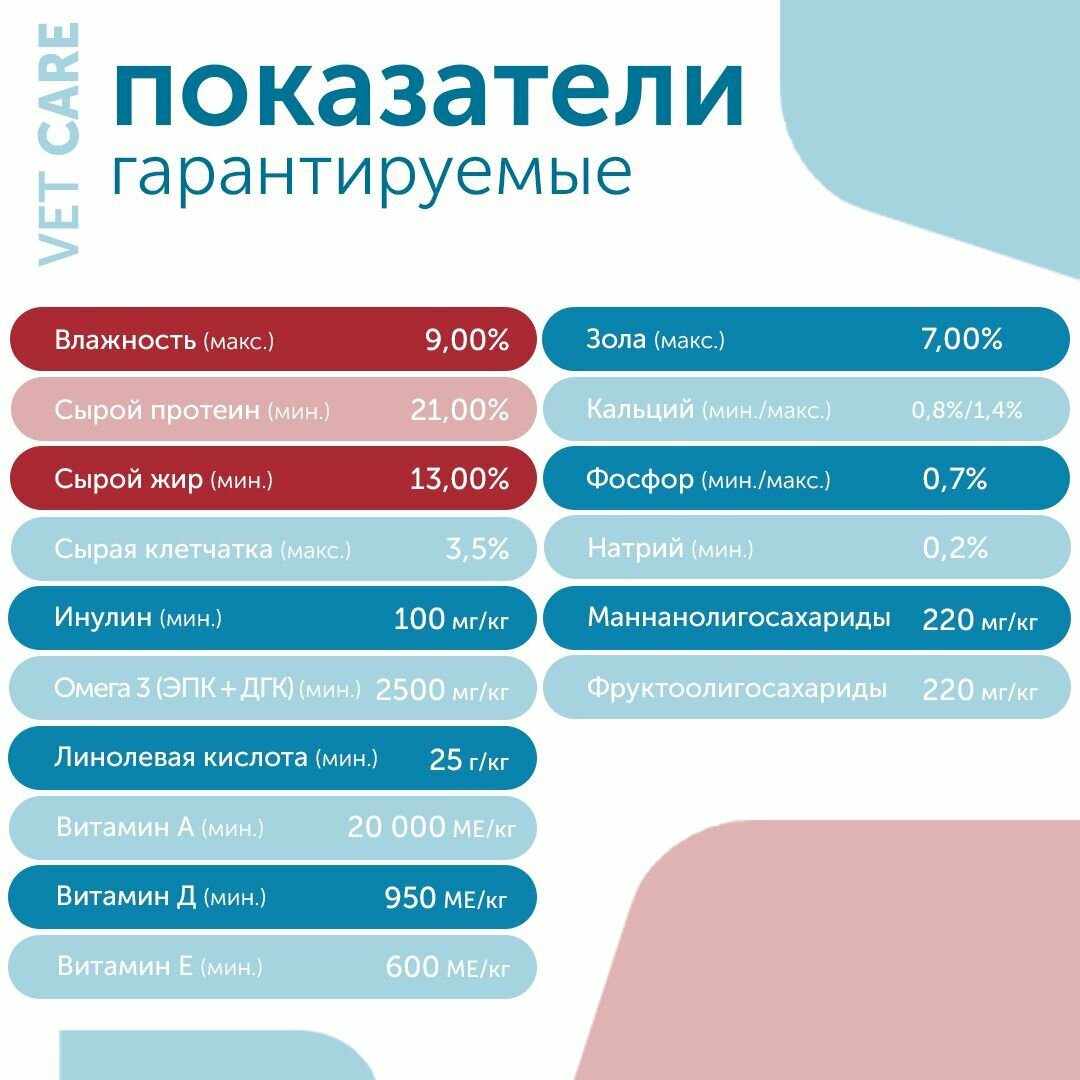 | Особые потребности | для ухода за ротовой полостью / для активных животных / для здоровья костей и суставов / для снижения запаха стула / для здоровья кожи и блеска шерсти / для профилактики МКБ / гипоаллергенный |