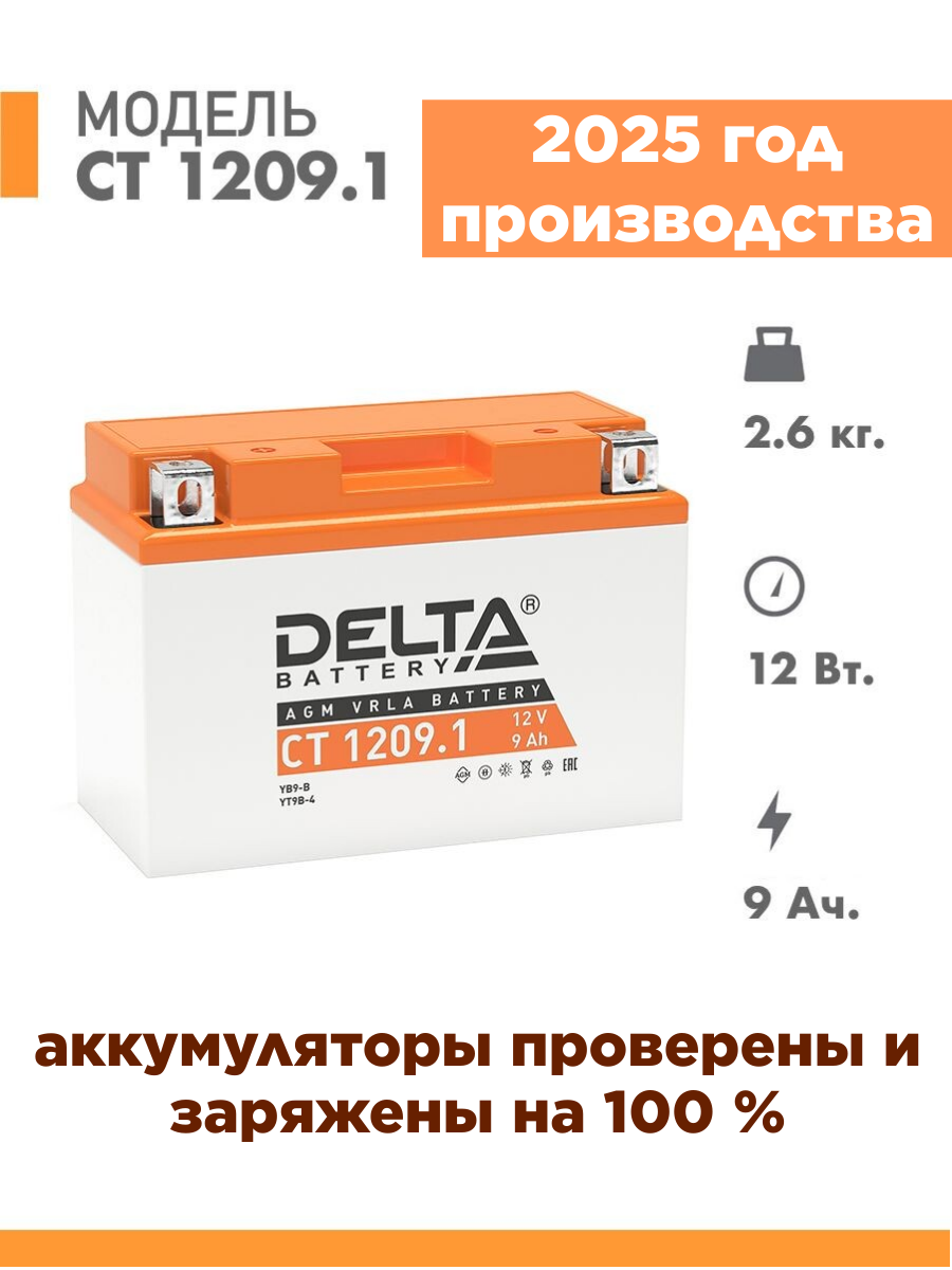 Аккумулятор мотоциклетный Delta CT1209.1 YT9B-BS 12V 9Ah AGM(залит и готов к применению)
