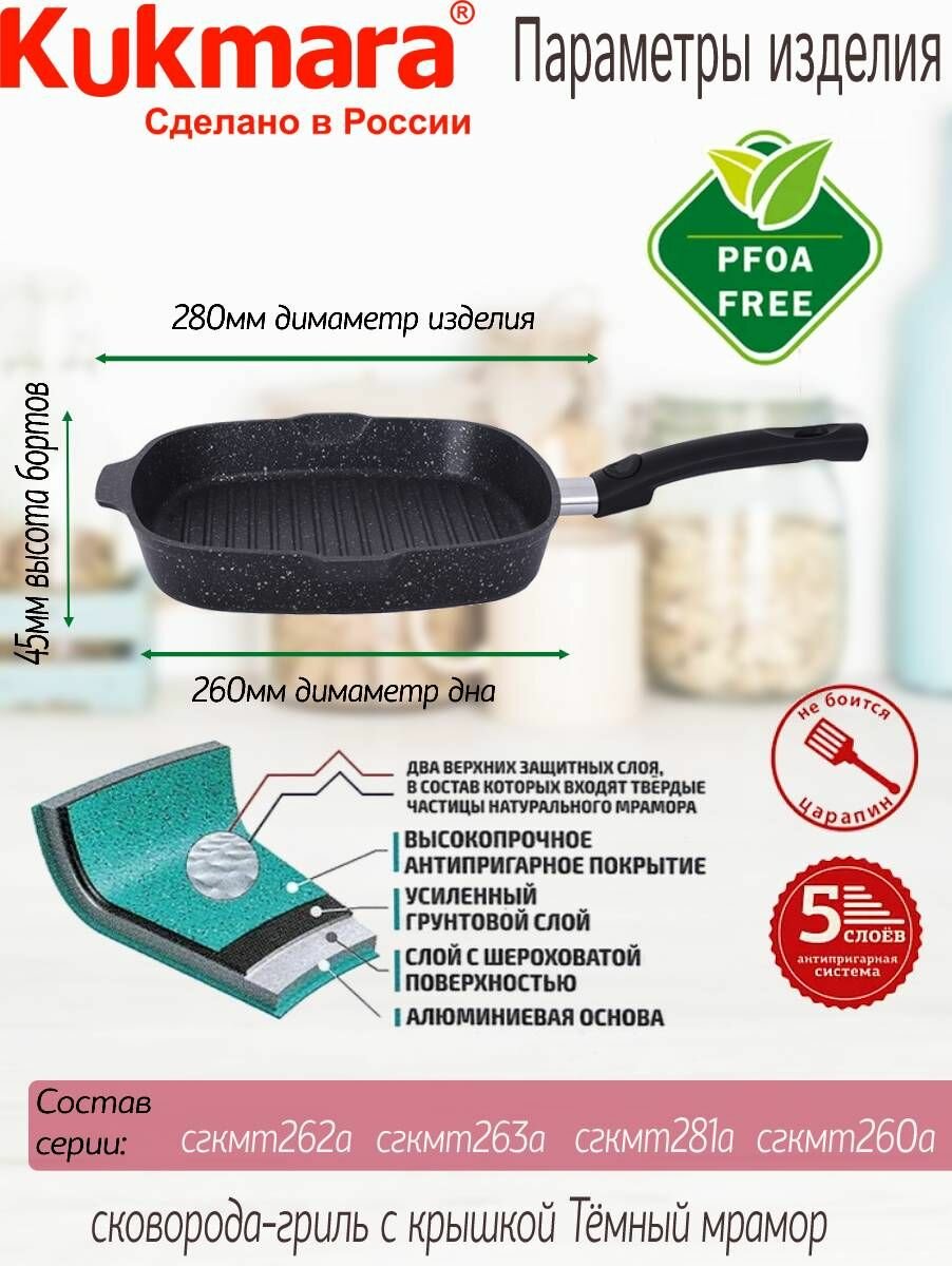 Сковорода гриль Кукмара Мраморная сгкмт281а со съемной ручкой квадратная антипригарная литой алюминий черный, 28×28×3.5см / посуда для газовых и