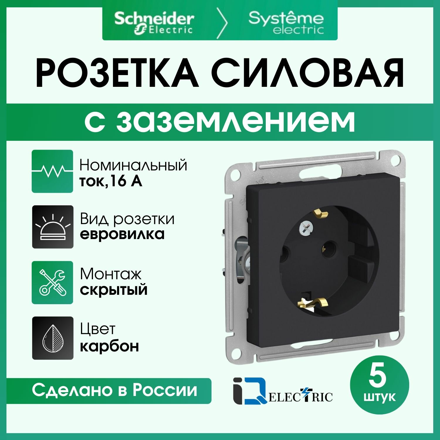 Купить Systeme Electric ATLASDESIGN розетка с заземлением, 16А, механизм, карбон ATN001043 комплект 5 шт