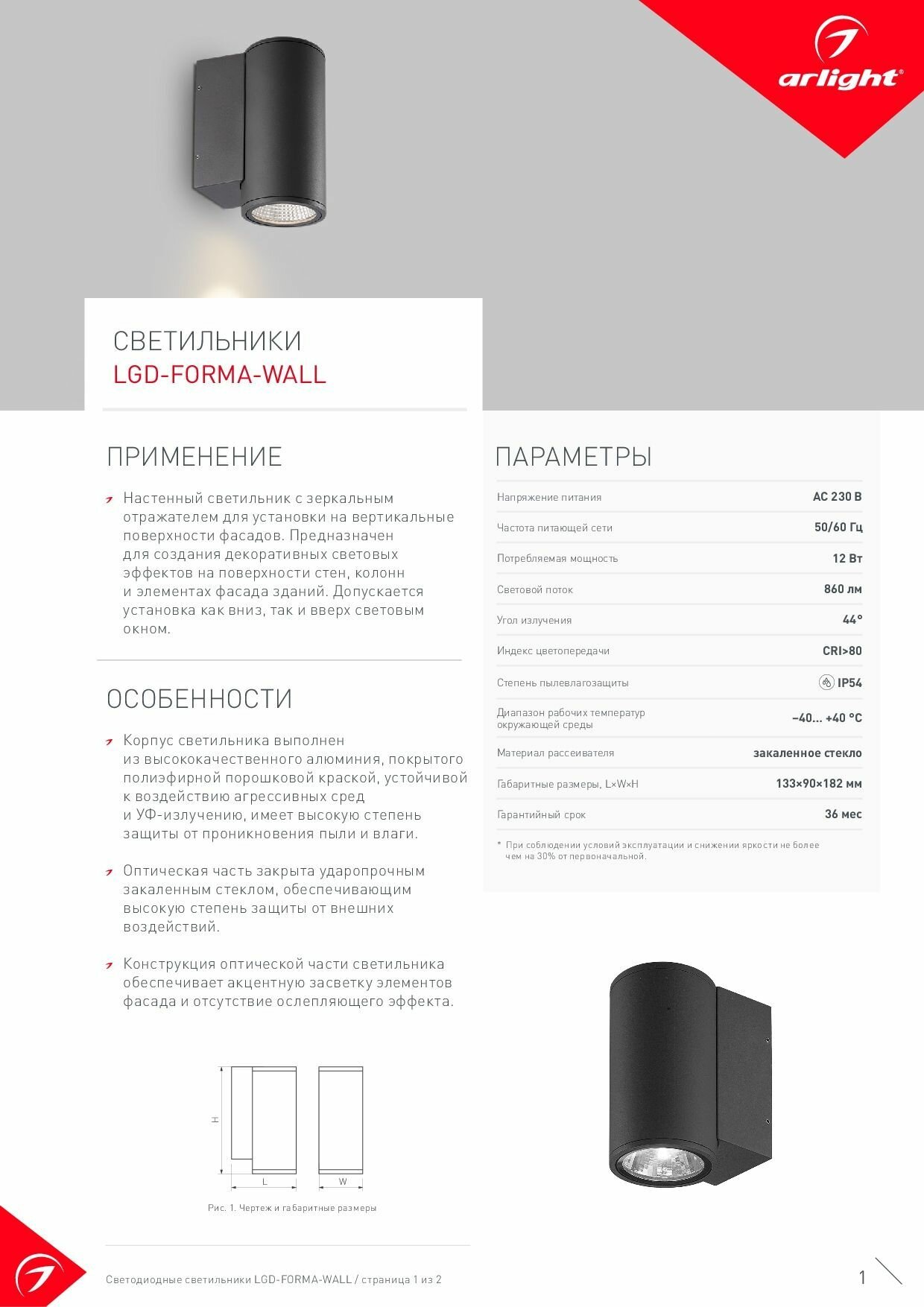 037256 Светильник LGD-FORMA-WALL-R90-12W Day4000 (BK, 44 deg, 230V) (Arlight, IP54 Металл, 3 года)