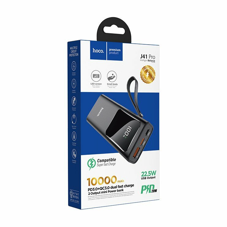 Универсальный Доп. Аккумулятор 10000mAh, J41 Pro, с диcплеем, HOCO, выход 1 USB (22,5W), 1 PD (20W), вход 1 PD, черный