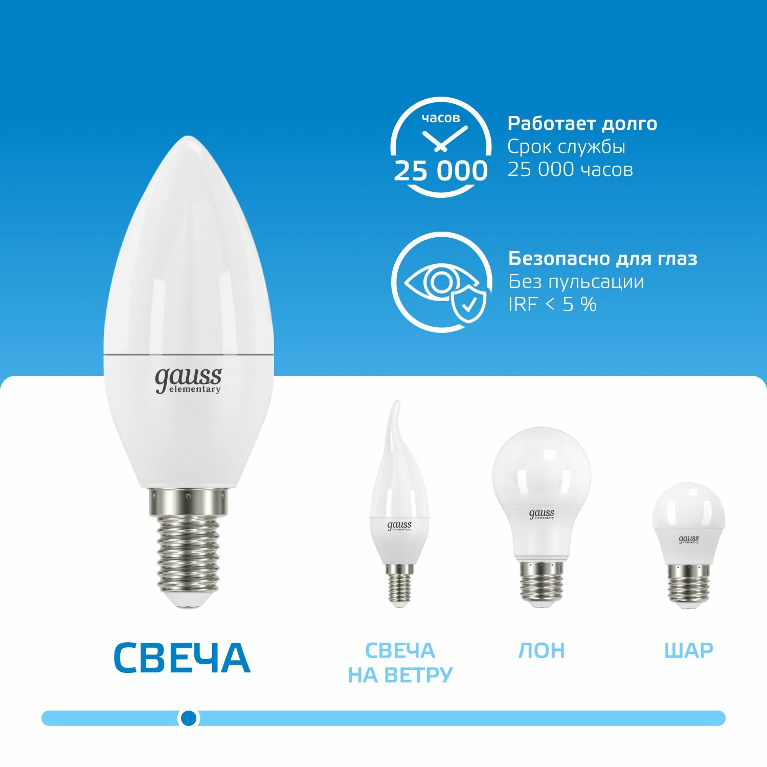Лампочка светодиодная E14 Свеча 6W нейтральный белый свет 4100К упаковка 10 шт. Gauss Elementary