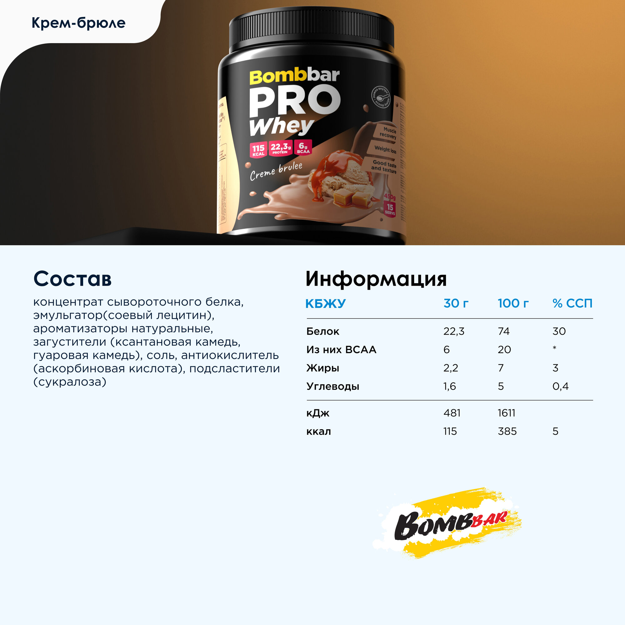 Bombbar Pro Whey Protein Протеиновый коктейль без сахара "Крем-брюле", 900 г