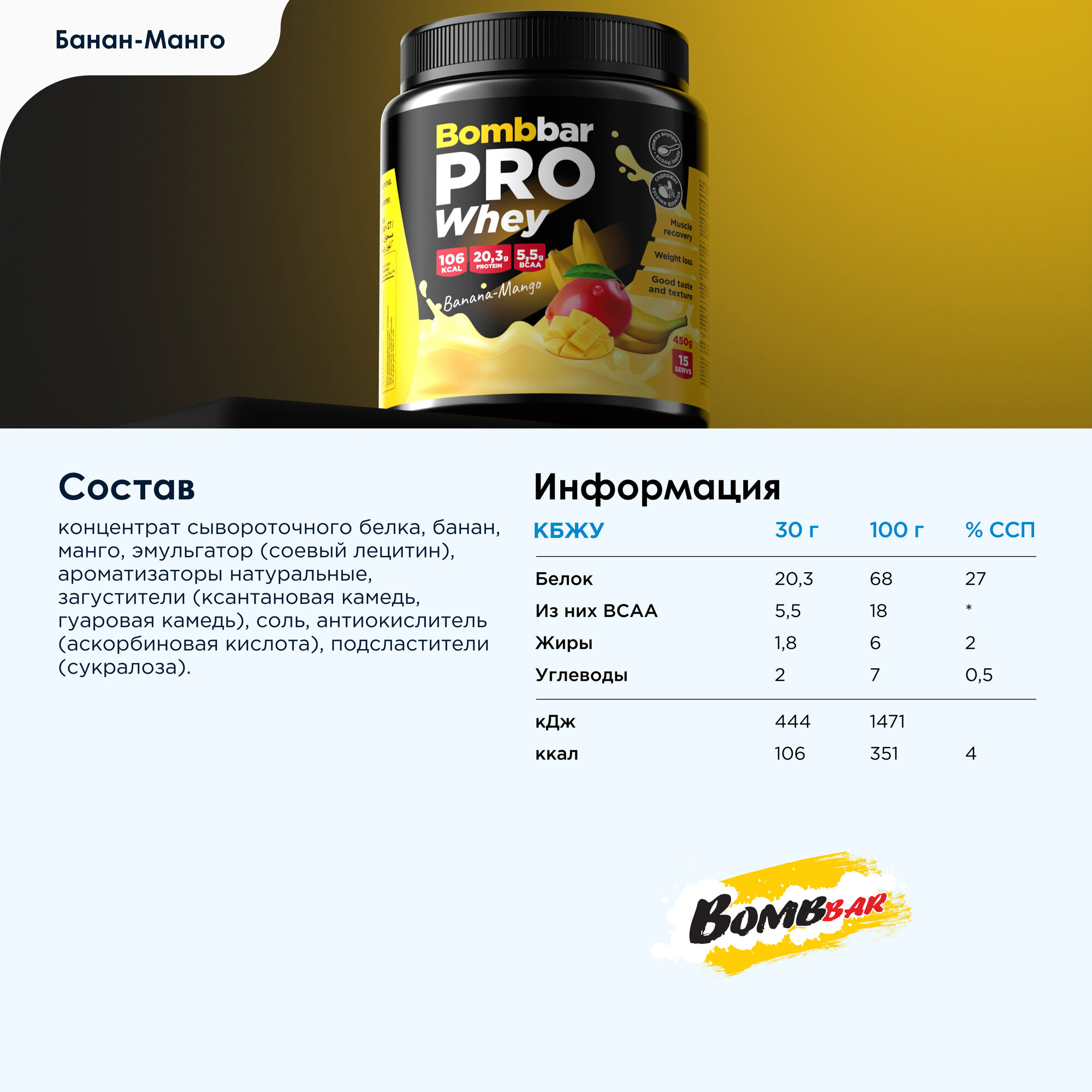 Купить Bombbar Pro Сывороточный протеин без сахара Whey Protein "Банан-манго" 450г