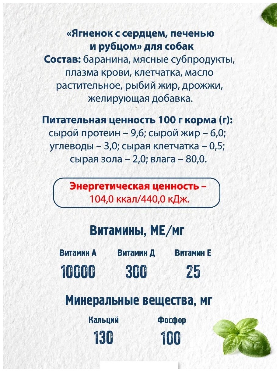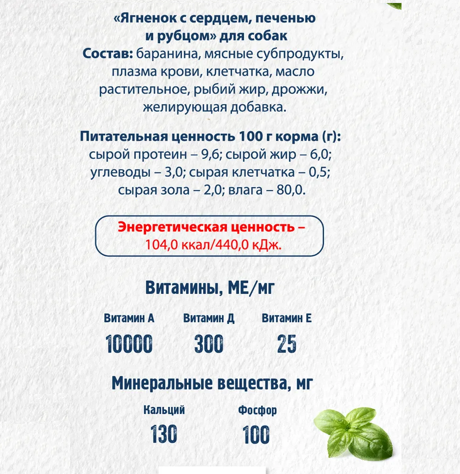 | Состав | Ягненок, мясные субпродукты, плазма крови, клетчатка, масло растительное, рыбий жир, дрожжи, желирующая добавка |