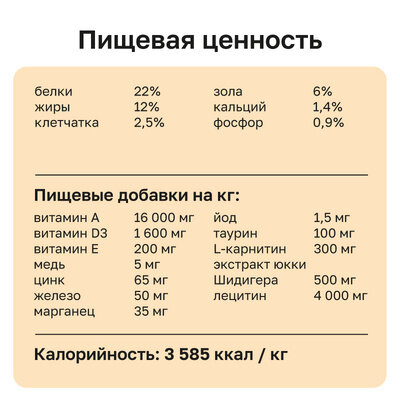 | Пищевая ценность | на 100г продукта: белок 22г, жир 12г, клетчатка 3г, зола 5,5г |