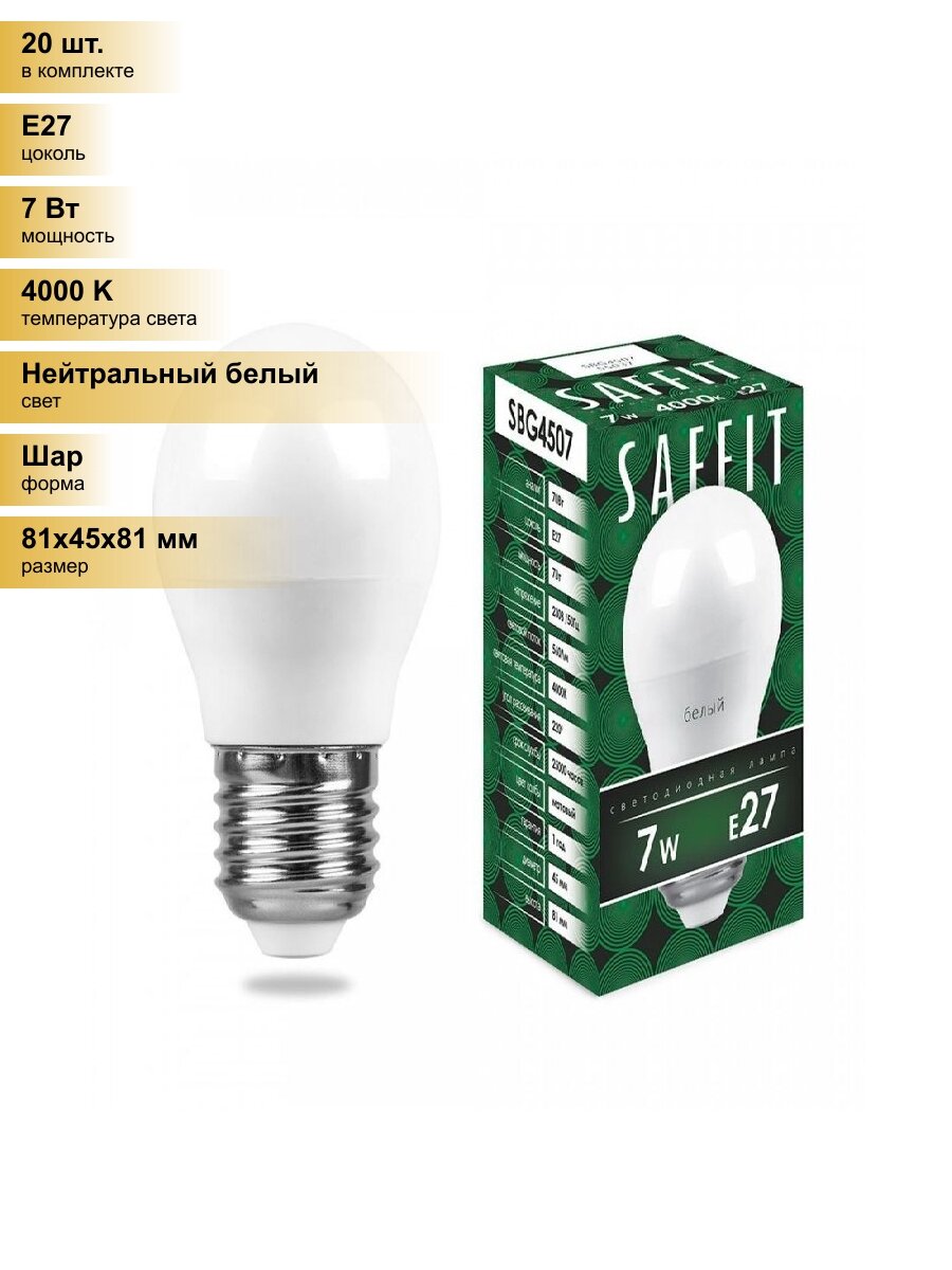 Купить (20 шт.) Светодиодная лампочка Saffit шар G45 E27 7W(560Lm) 4000K 4K матовая 81х45 SBG4507 55037 Нейтральный белый. Цоколь E27