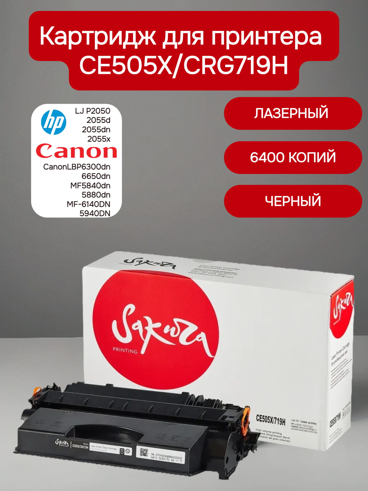 Картридж SAKURA CE505X/CRG719H для HP, Canon, черный, 6400 к. LJ P2050/2055d/2055dn/2055x/СanonLBP6300dn/6650dn/MF5840dn/5880dn/MF-6140DN/5940DN