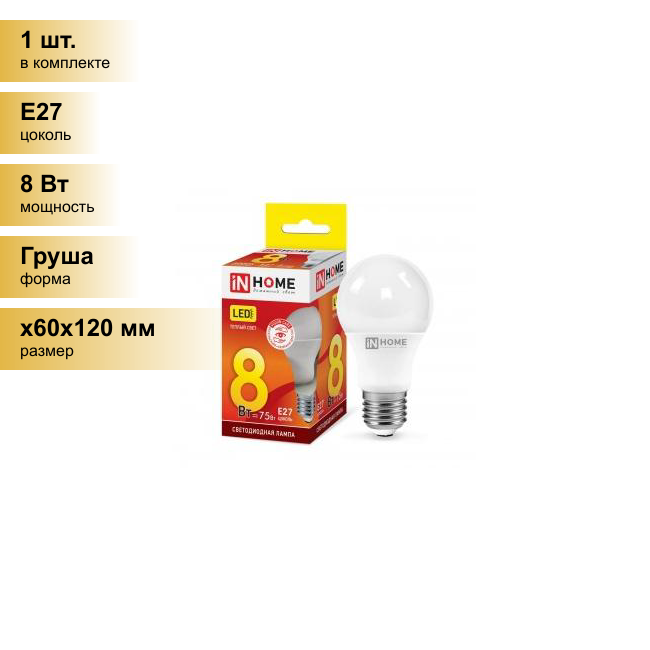 Лампа светодиодная IN HOME LED-A60-VC, 8 Вт, 230 В, Е27, 3000 К, 760 Лм