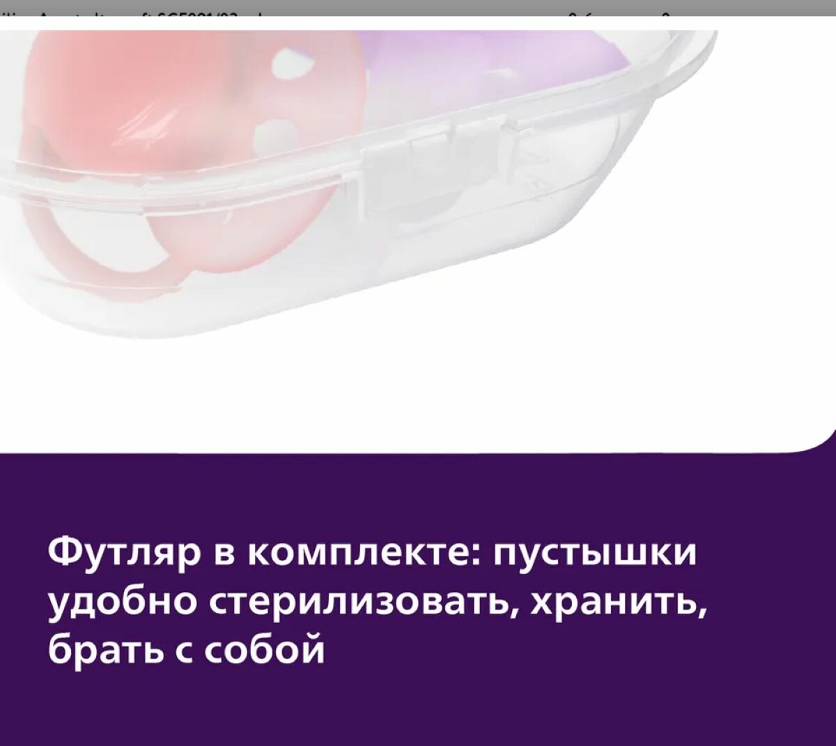 | Комплектация | пустышка Avent Ultra Soft 2 шт., контейнер для стерилизации |
