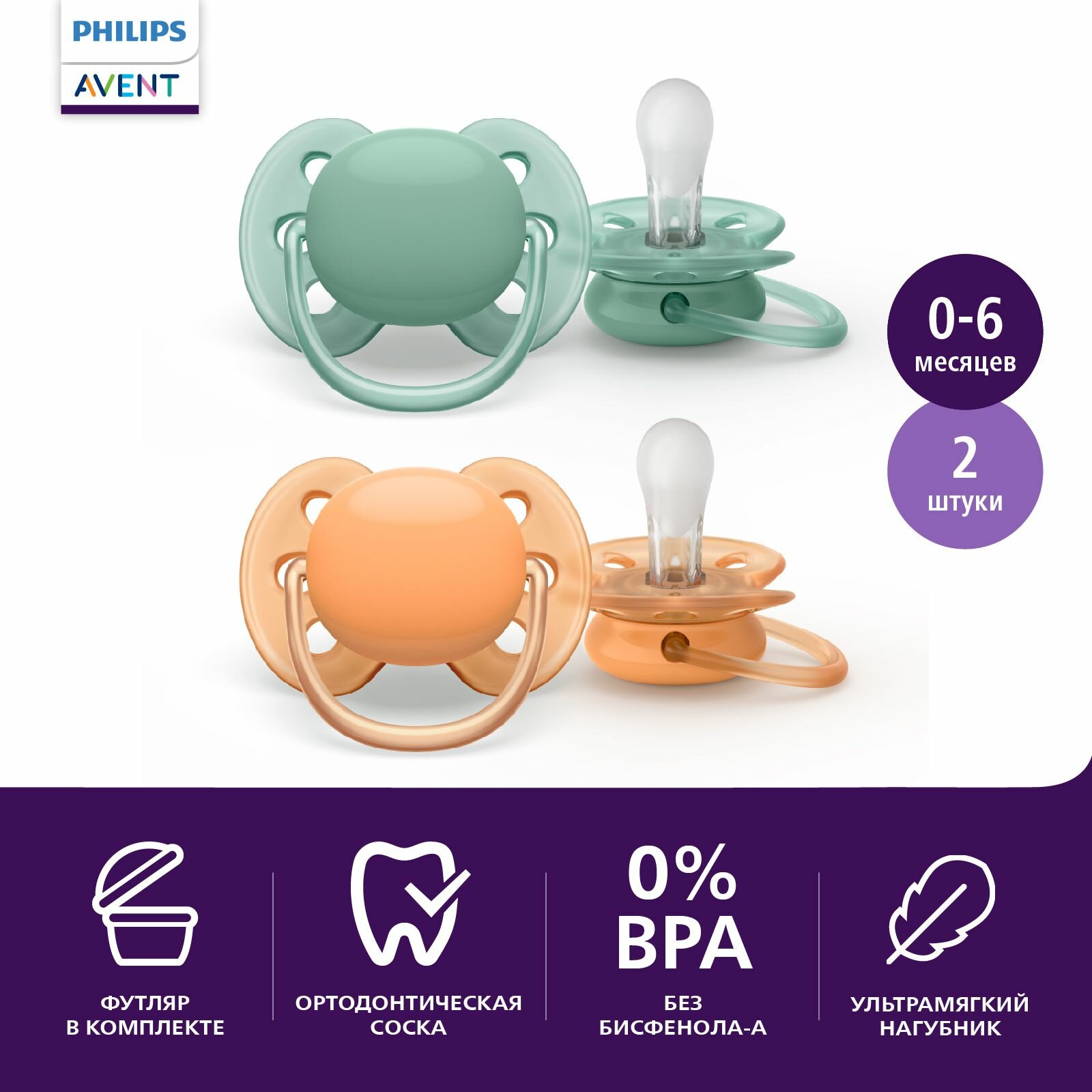 Купить Пустышка Philips Avent SCF091/03 Ultra Soft, 2 шт., 0-6 мес., с контейнером для стерилизации, оранжевый/зеленый