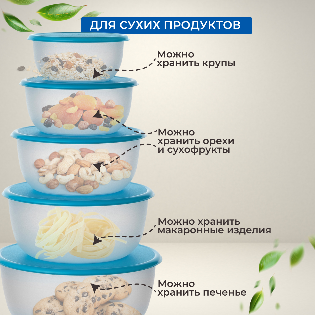 | Комплектация | 5 контейнеров: 0.2 л, 0.4 л, 0.7 л, 1 л и 1.4 л |