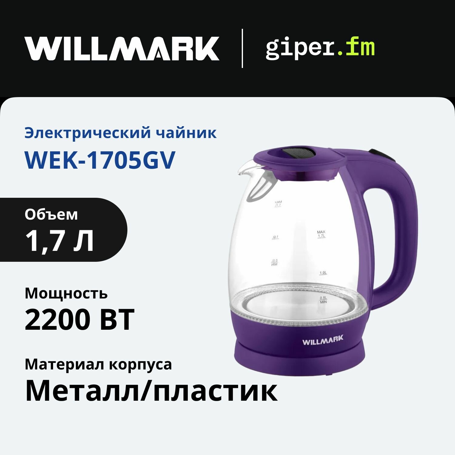 Купить Чайник электрический Willmark WEK-1705GV стеклянный, мощность 2200 Вт, емкость 1.7 л, подсветка, фиолетовый