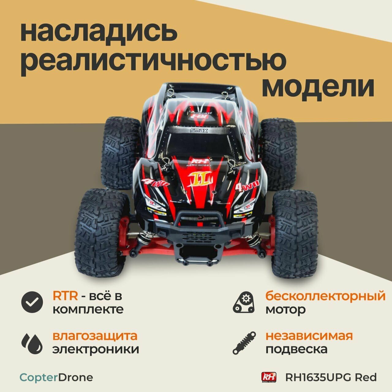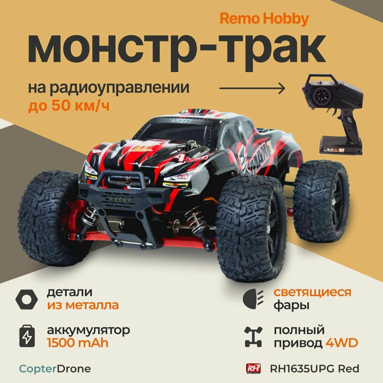Remo Hobby Радиоуправляемый монстр Remo Hobby SMAX UPGRADE 4WD RTR масштаб 1:16 2.4G — RH1635UPG-RED
