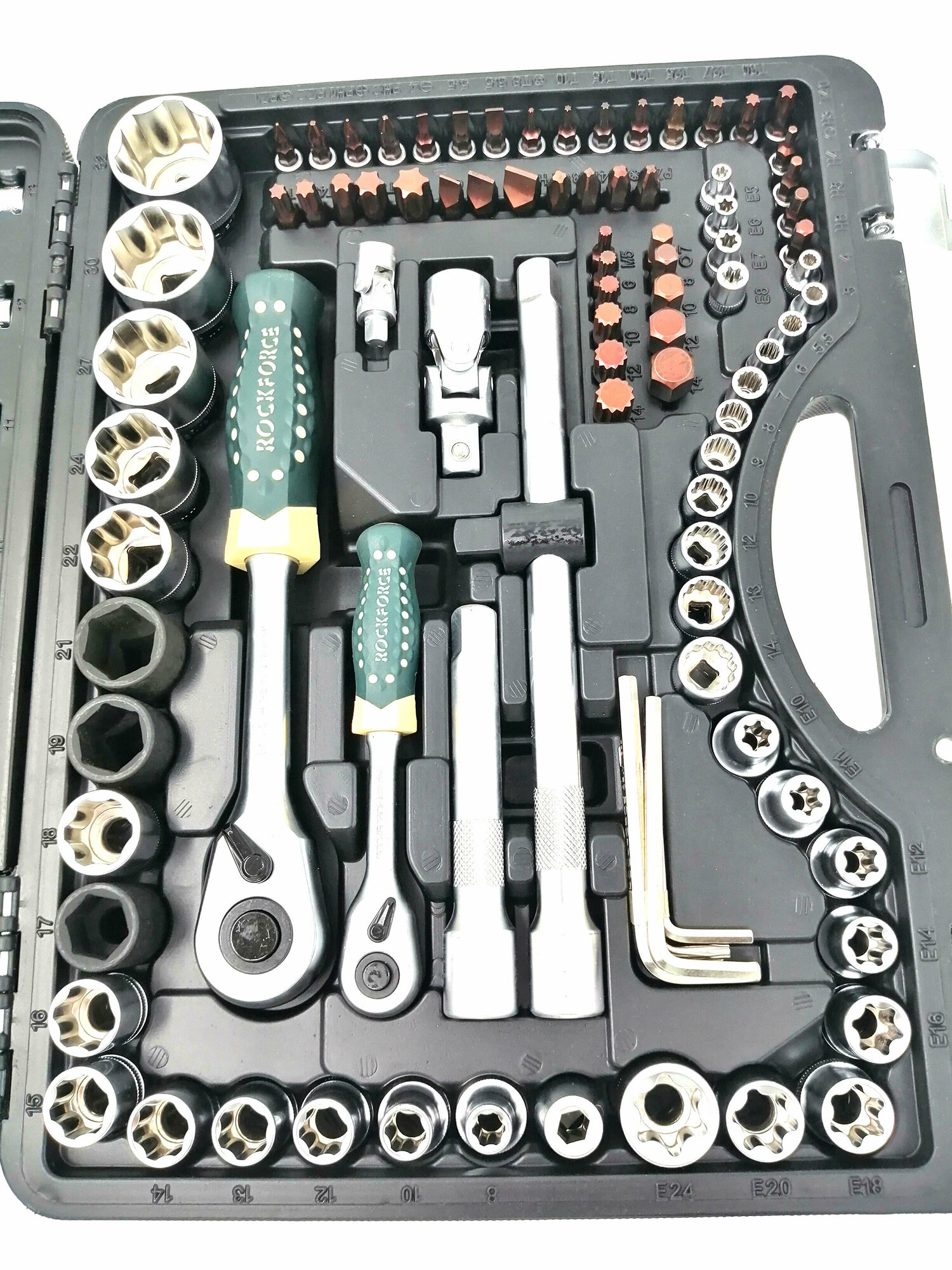 | Головки торцевые подробно | 1/4" 6-гранные головки - 4; 5; 5.5; 6; 7; 8; 9; 10; 12; 13; 14 мм - 13 шт; 6-гранные головки глубокие - 6; 7; 8; 9; 10; 11; 12; 13 (50 мм) - 8 шт; 1/4" головки Е-профиль - E5; E6; E7; E8 - 5 шт; 1/2" 6-гранные головки - 8;10; 12; 13; 14; 15; 16; 18; 22; 24; 27; 30; 32 мм - 17 шт; 6-гранные головки глубокие - 14; 15; 17; 19; 22 (77 мм) - 5 шт; 1/2" Головки Е-профиль - E10; E11; E12; E14; E16; E18; E20; E24 - 8 шт; "; головка свечная - 16 мм; 20.6 мм - 2 шт |