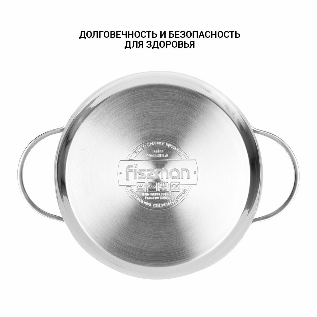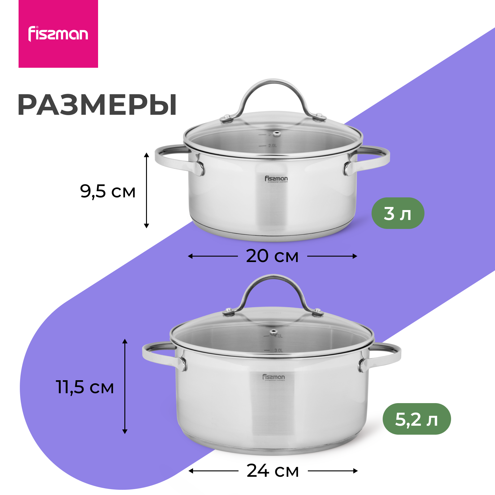15816 FISSMAN Набор посуды GABRIELA 8 пр.(нерж. сталь) Ковш 14х7,5см - 1,1л, Кастрюля 16х7,5см - 1,5л, Кастрюля 20х9,5см - 3л, Кастрюля 24х11,5см - 5,2л; Крышки стекло; Индукция; Термоаккумулирующее многослойное дно.