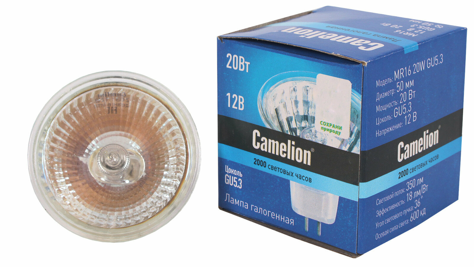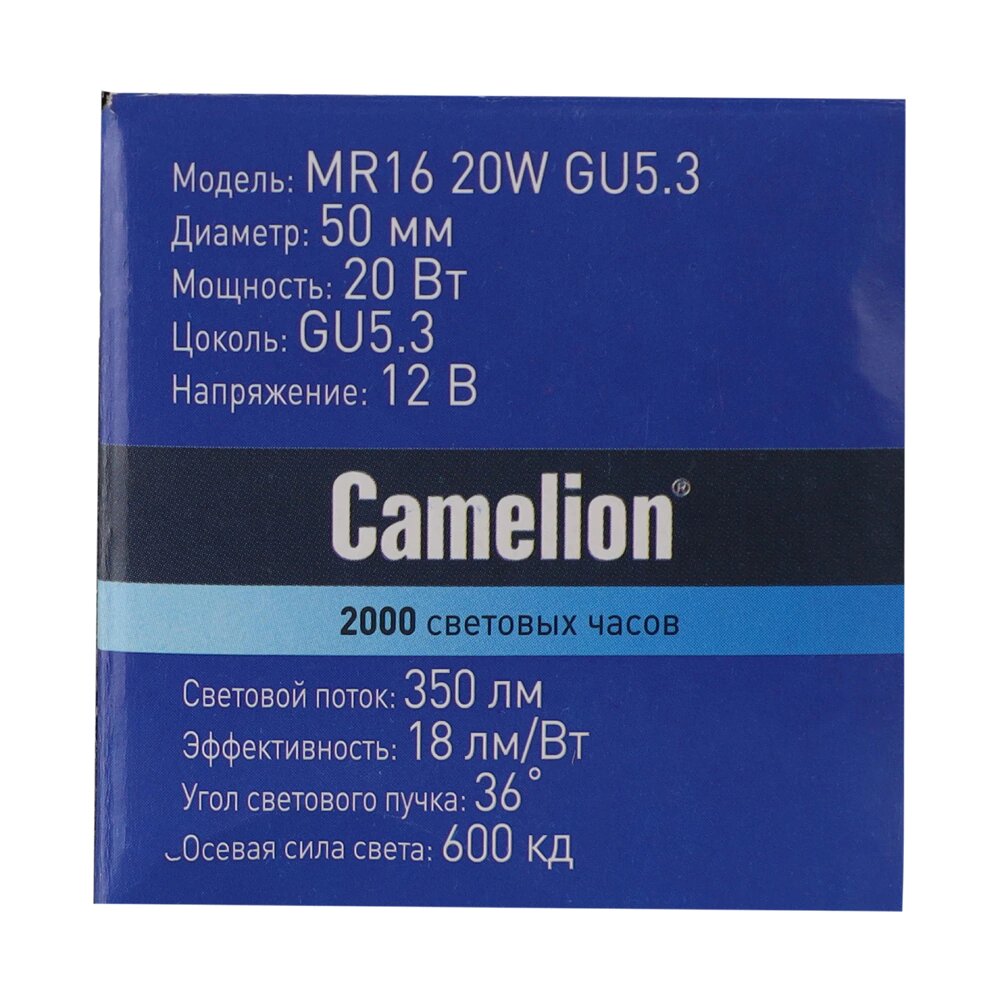 Галогенная лампа 20 Вт, GU5.3, диаметр 55 мм, высота 45 мм, 12 В - Camelion MR16 12V 20W