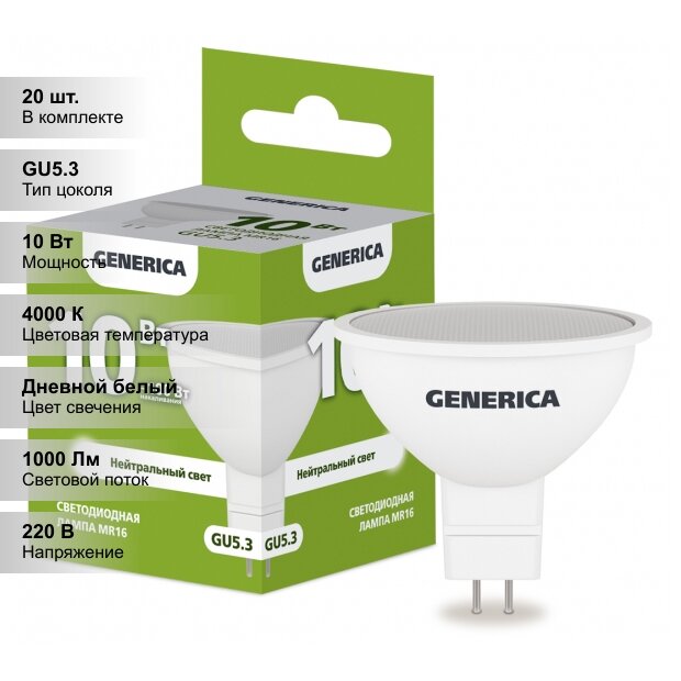 Лампочка светодиодная GENERICA 10Вт=100Вт 4000К нейтральный свет MR16 GU5.3 софит (комплект из 10 шт.)