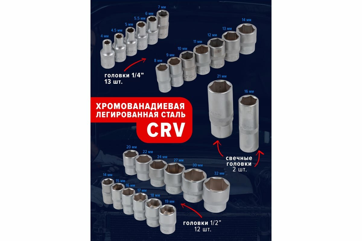 | Головки торцевые подробно | 1/4": 4, 4.5, 5, 5.5, 6, 7, 8, 9, 10, 11, 12, 13, 14 мм; трещетка 1/4": 45 зубов; удлинитель 1/4": 50, 100 мм; карданный шарнир 1/4"; вороток т-образный 1/4": 110 мм; гибкий удлинитель 1/4": 145 мм; с битами 1/4": SL5.5,, SL6.5, PH1, PH2, PZ1, PZ2, T8, T10, T15, T20, T25, T30, H3, H4, H5, H6; 1/2": 14, 15, 16, 17, 18, 19, 20, 22, 24, 27, 30, 32 мм; трещетка 1/2": 45 зубов; удлинитель 1/2": 120, 240 мм; карданный шарнир 1/2"; свечные 1/2": 16, 21 мм; |