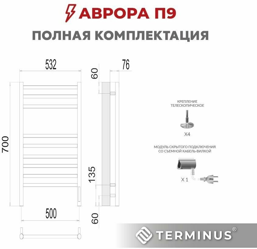 Полотенцесушитель TERMINUS Аврора П9 (ШВ:532x700) электр, нерж. сталь, sensor quick touch