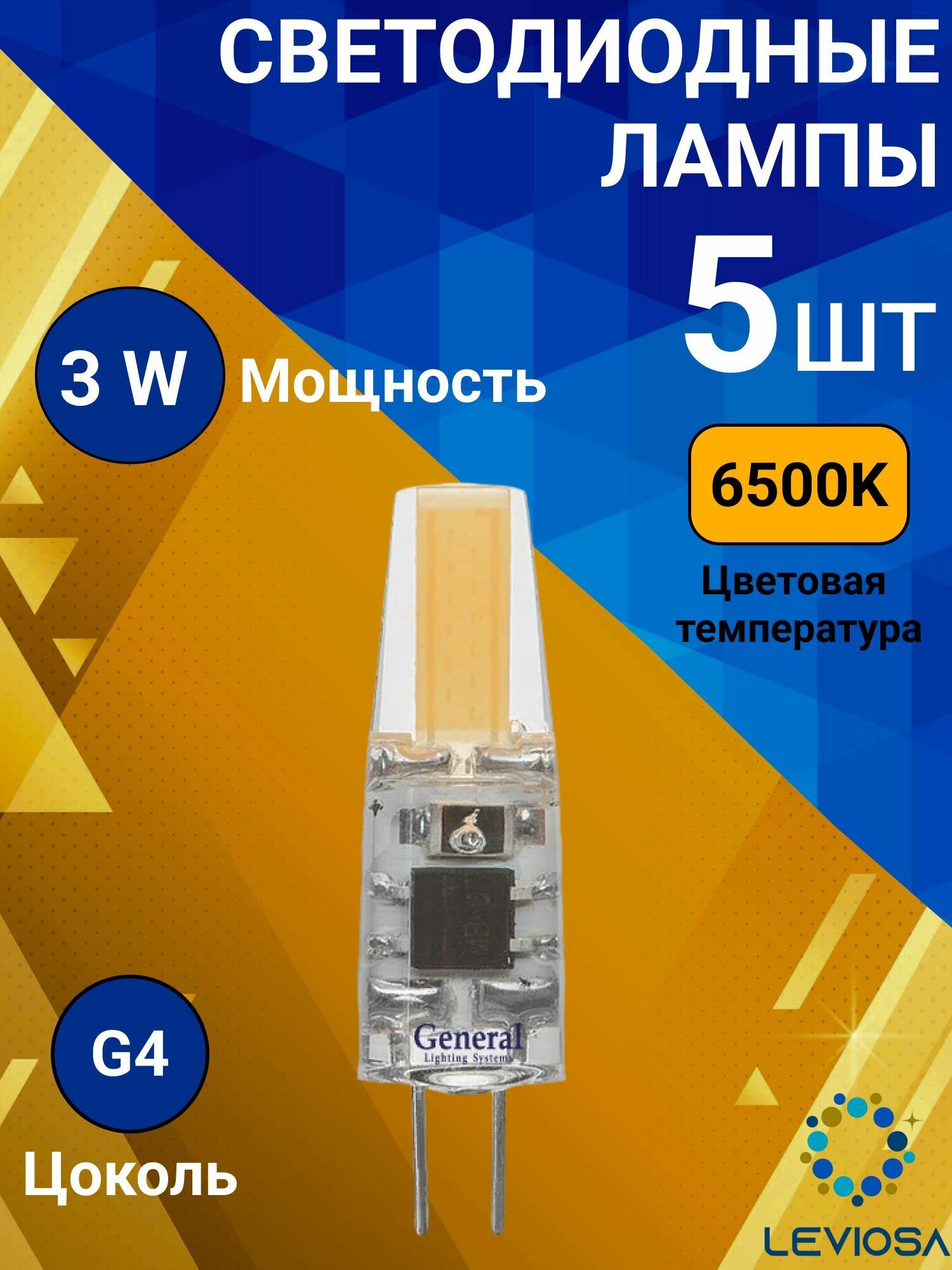 Светодиодные лампы 12 вольт, General, Комплект из 5 шт, Мощность 3 Вт, Цоколь G4, Дневной свет
