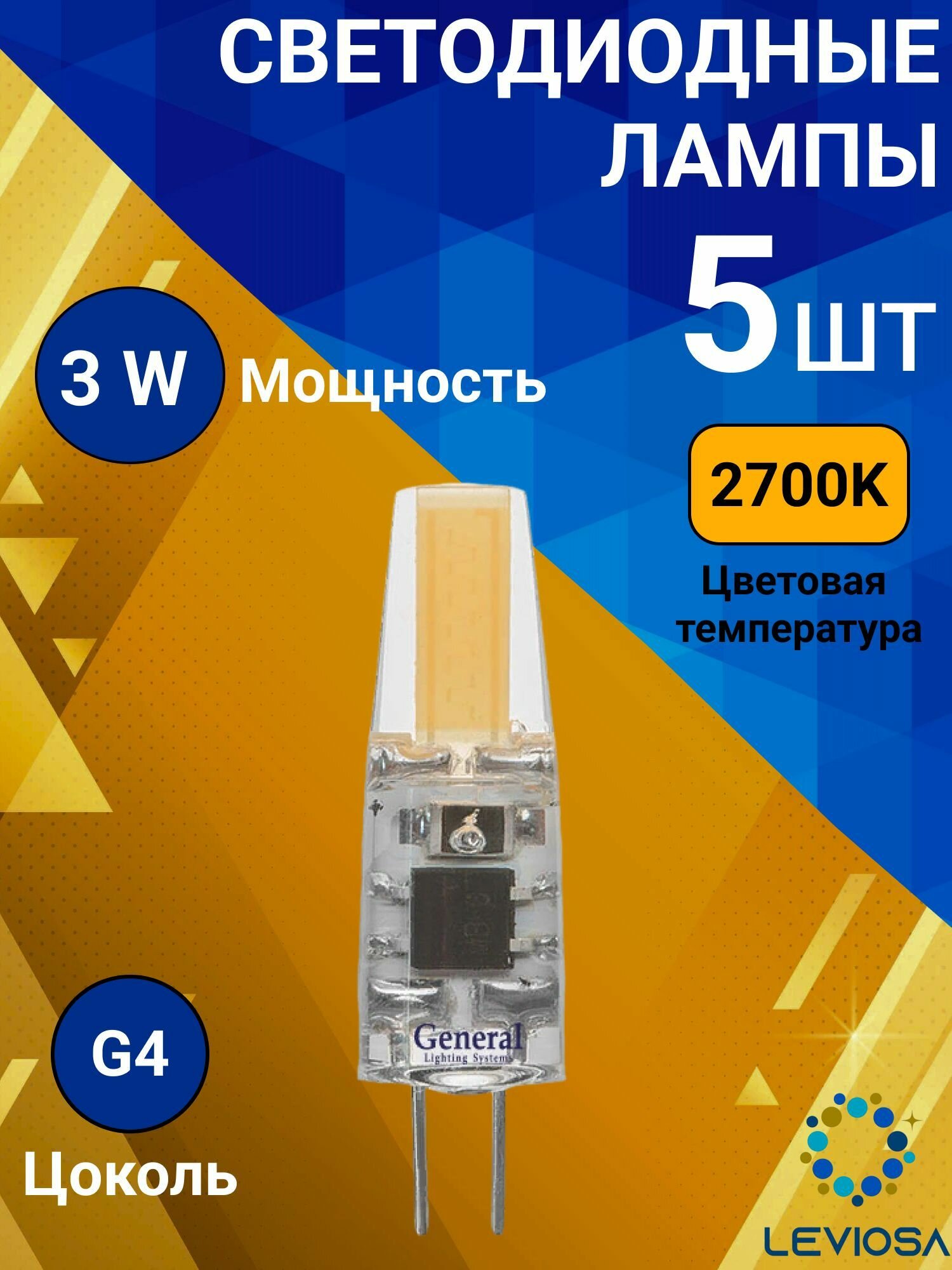 Светодиодные лампы 12 вольт, General, Комплект из 5 шт, Мощность 3 Вт, Цоколь G4, Теплый свет