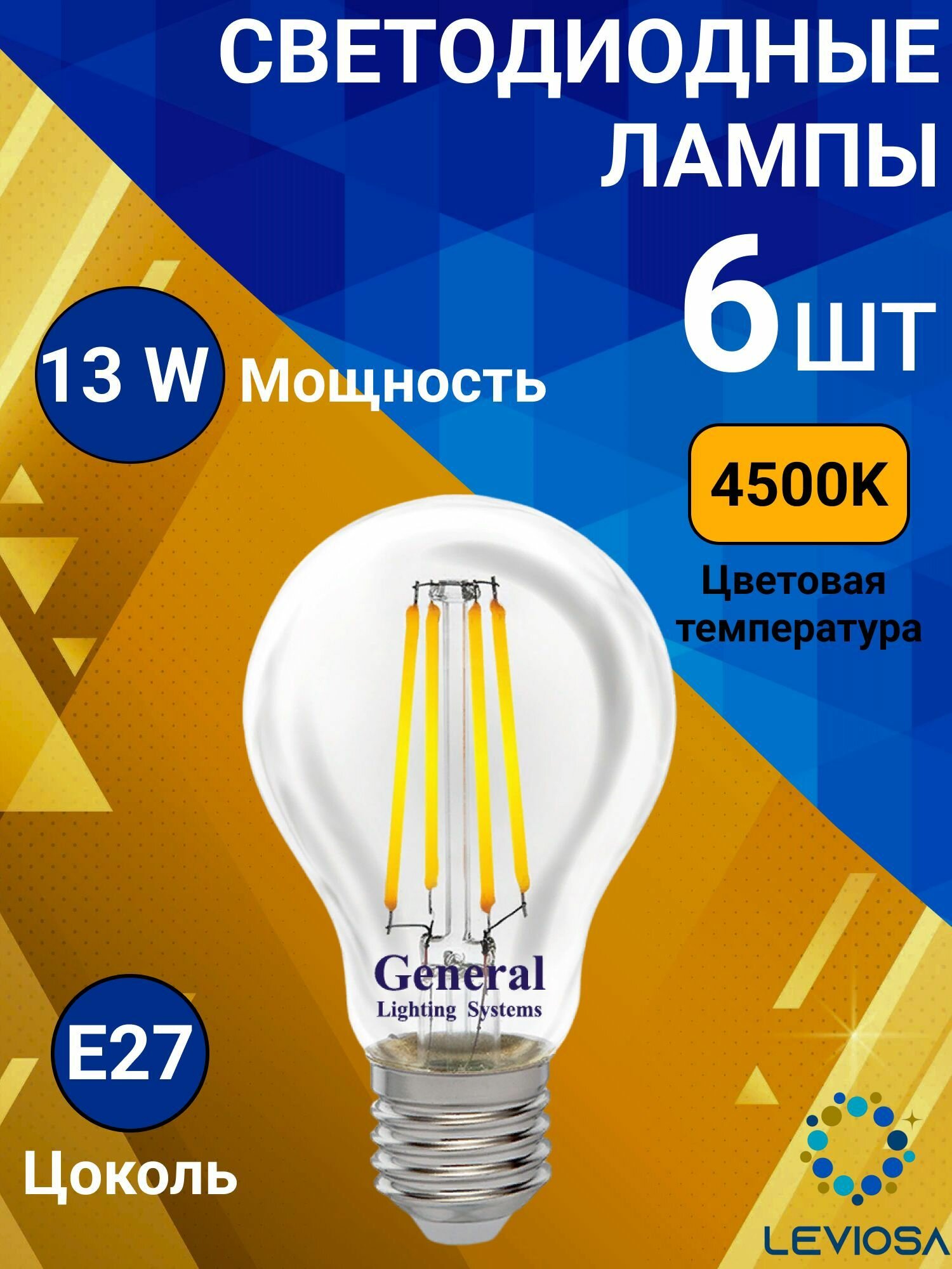 Светодиодные лампы филаментная диммируемая, General, Комплект из 6 шт., Мощность 13 Вт, Цоколь E27, Нейтральный свет