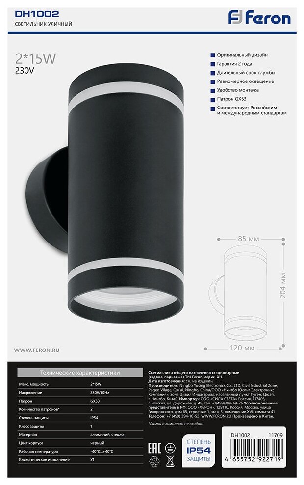 Светильник садово-парковый Feron DH1002, на стену вверх/вниз, 2* GX53, 230V, черный 11709