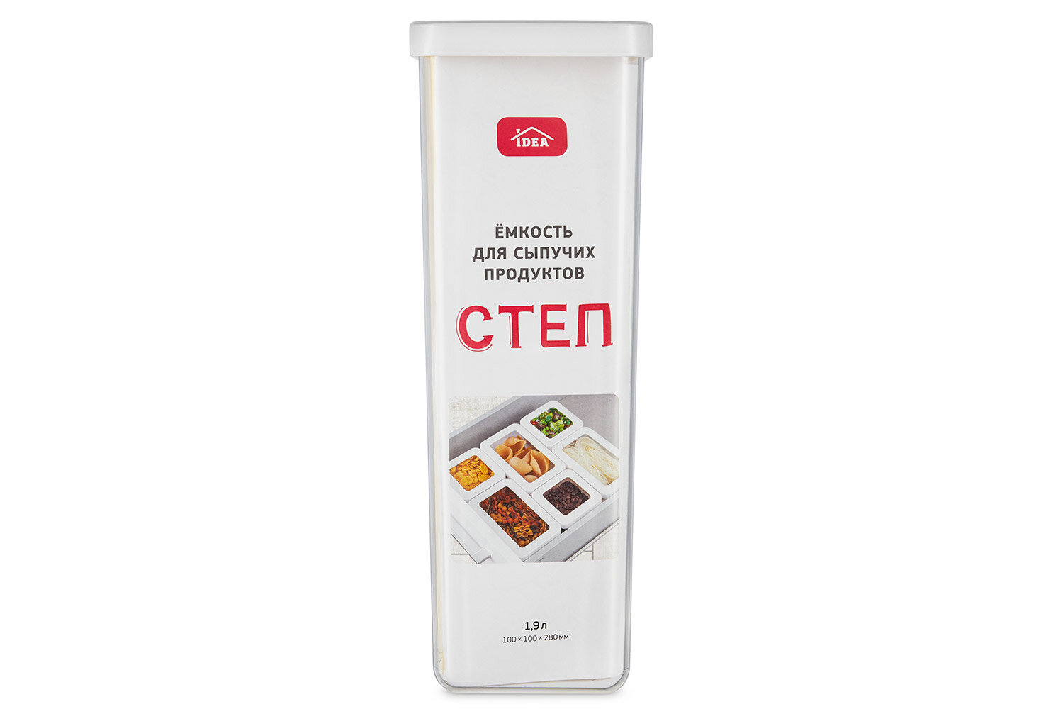 Емкость д/сыпучих продуктов 1,9л Степ квадр. 10*10*28см белый (12) М1294 10*10*28см