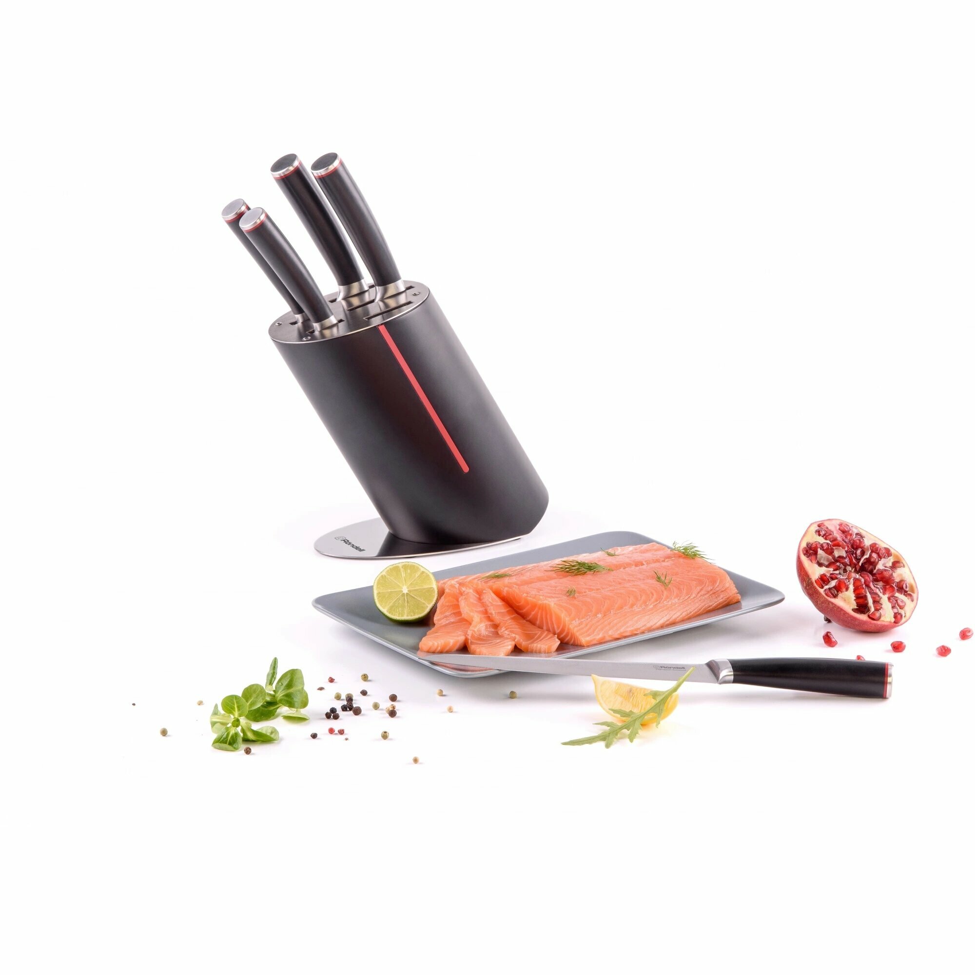 | Комплектация | - нож для овощей 9 см; - нож универсальный 12,7 см; - нож разделочный 20 см; - нож для хлеба 20 см; - нож поварской 20 см; - подставка. |