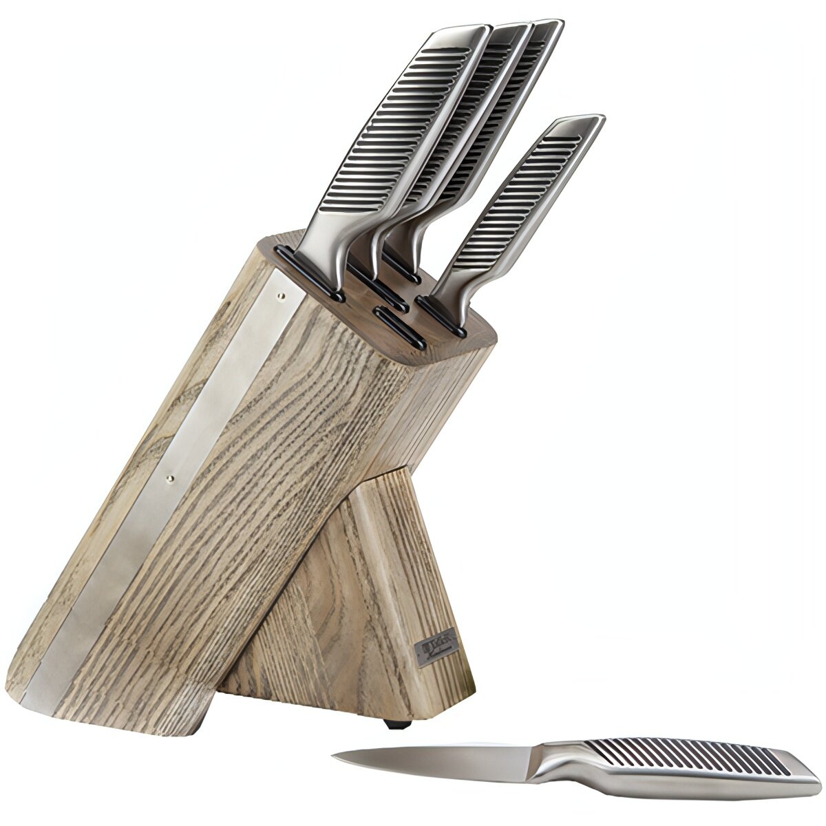 | Комплектация | - нож поварской (лезвие 20 см х 2,5 мм); - нож для нарезки (лезвие 20,5 см х 2,5 мм); - нож для хлеба (лезвие 20,5 см х 2,5 мм); - нож универсальный (лезвие 12 см х 1,8 мм); - нож для чистки (лезвие 8 см х 1,8 мм); - подставка из дерева ясеня. |