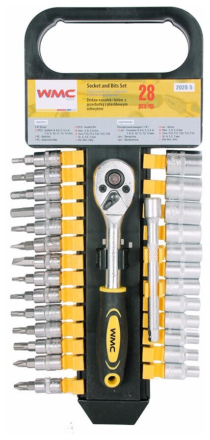 Набор торцевых головок и бит WMC-2028-5: с трещоткой 1/4' 28 пр. в пластиковом держателе WMC TOOLS