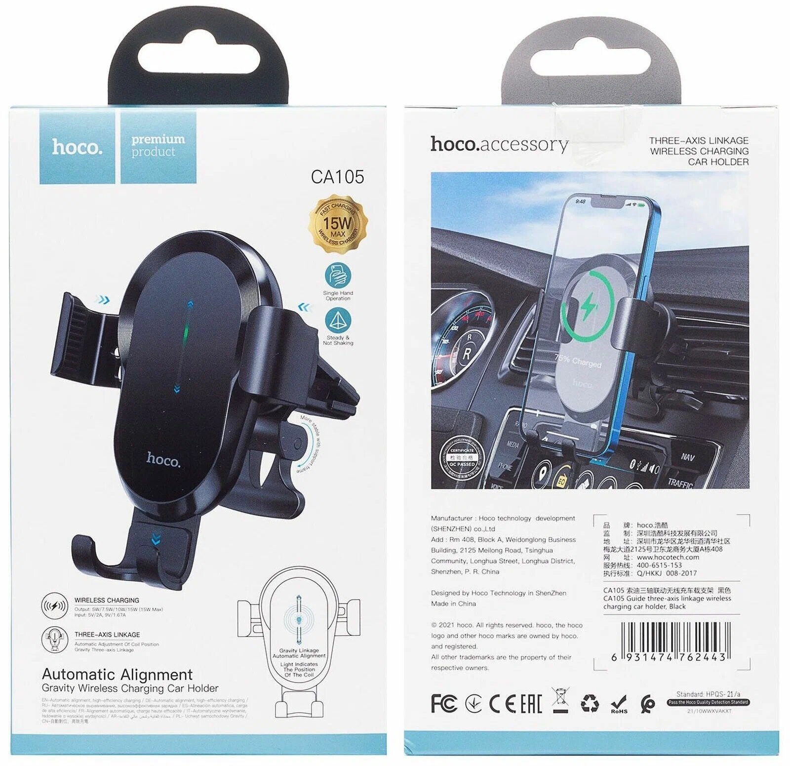 Держатель автомобильный HOCO, CA105, Guide, для смартфона, пластик, воздуховод, беспроводная зарядка, цвет: чёрный